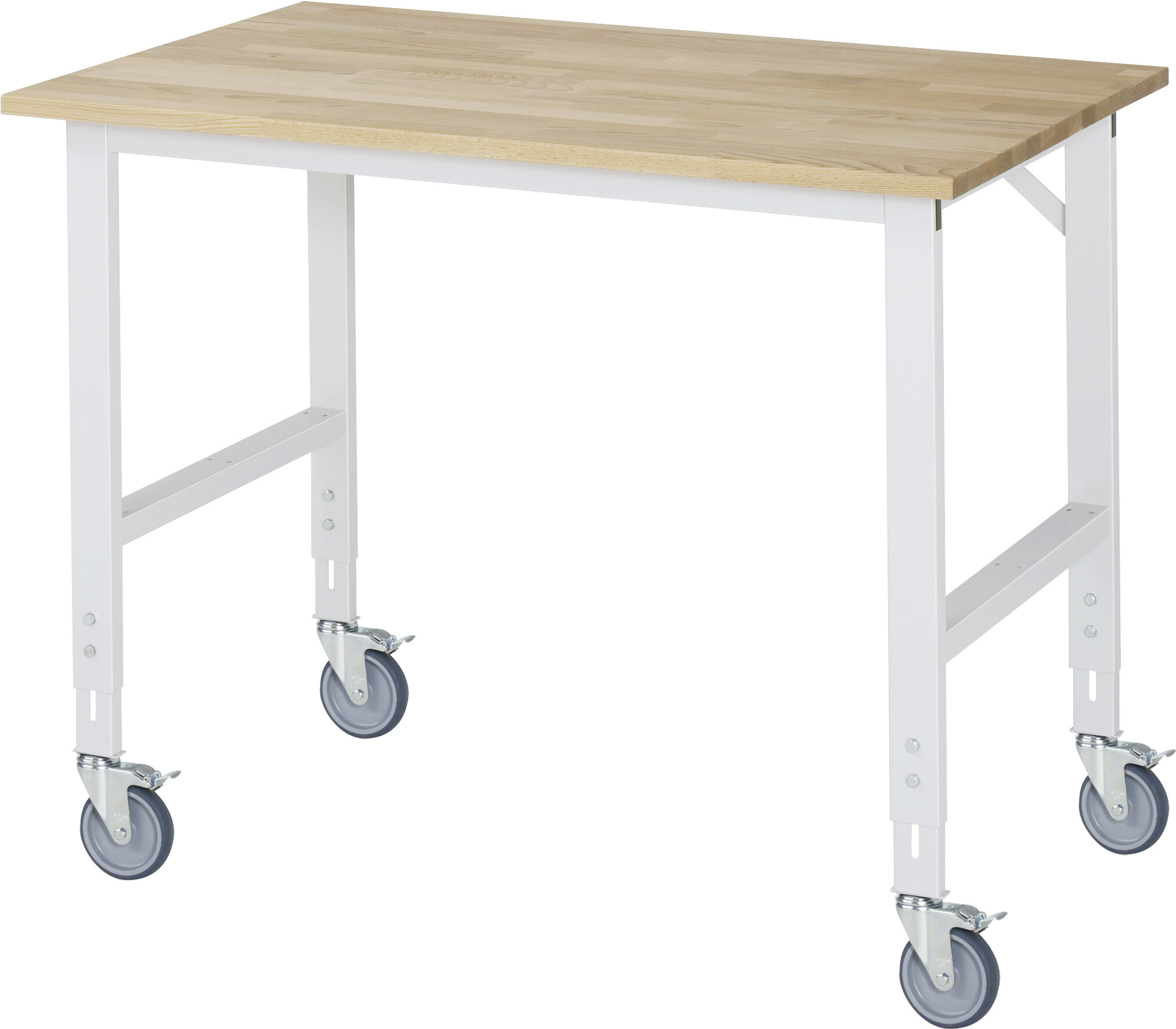 Fahrbarer Arbeitstisch Tom (verstellbar) B1250 x T800 x H910-1230 mm Buche-Massiv-Arbeitsplatte, Stärke 25 mm. Gestell Vierkantrohr. 4 Lenkrollen mit Feststeller Pulverbeschichtung Flächenlast max. 450 kg Lieferung zerlegt - einfachste Montage Qualitätsgarantie 5 Jahre Made in Germany