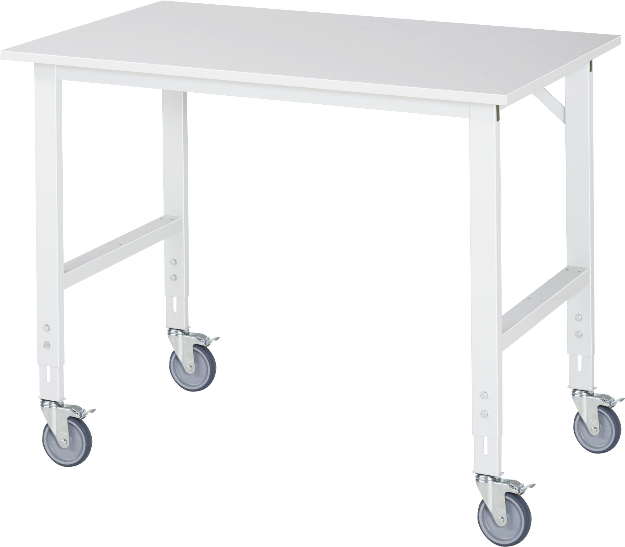 Fahrbarer Arbeitstisch Tom (verstellbar) B1250 x T800 x H910-1230 mm Melaminharzbeschichtete-Platte 22 mm. Gestell Vierkantrohr. 4 Lenkrollen mit Feststeller Pulverbeschichtung Flächenlast max. 450 kg Lieferung zerlegt - einfachste Montage Qualitätsgarantie 5 Jahre Made in Germany