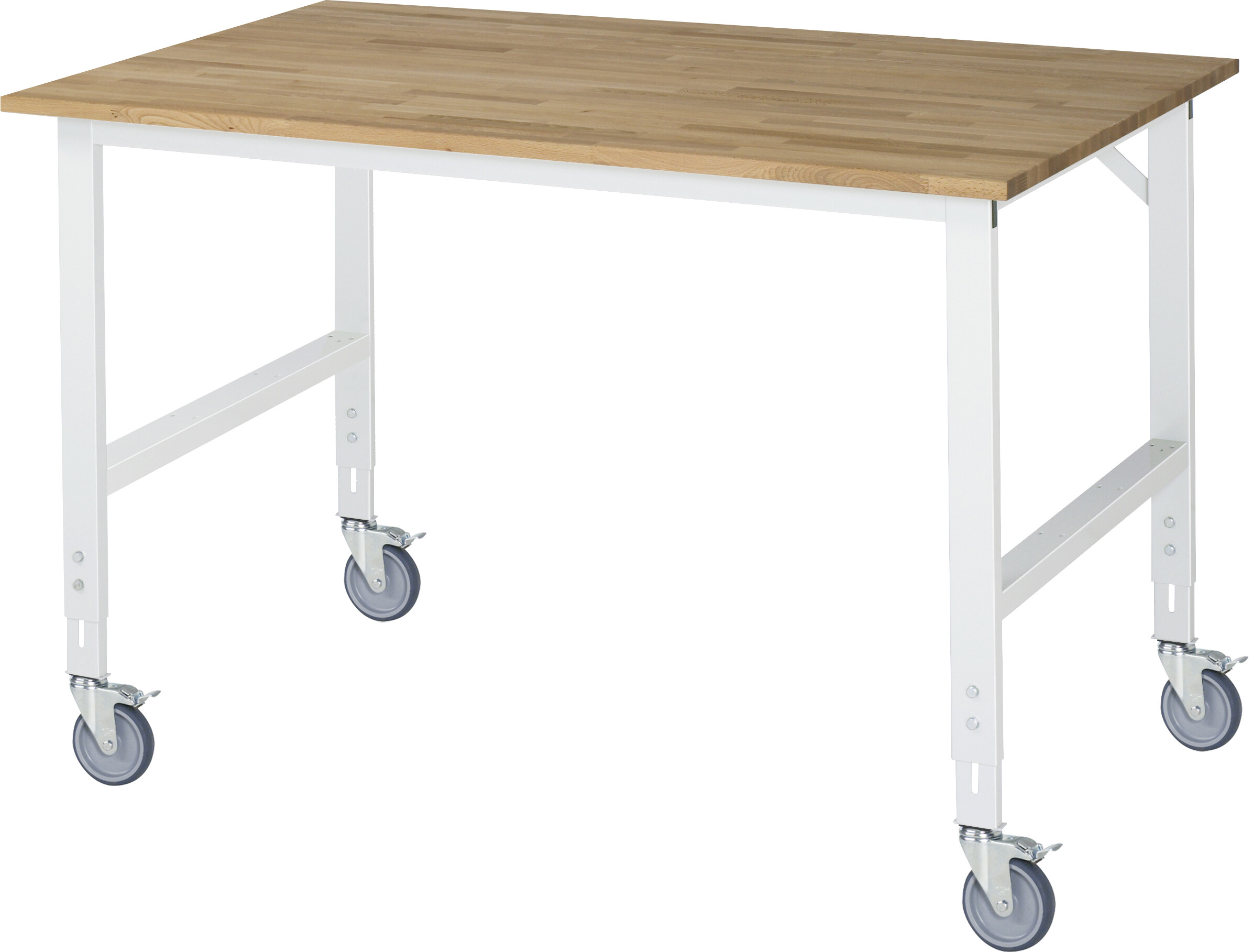Fahrbarer Arbeitstisch Tom (verstellbar) B1500 x T1000 x H910-1230 mm Buche-Massiv-Arbeitsplatte, Stärke 25 mm. Gestell Vierkantrohr. 4 Lenkrollen mit Feststeller Pulverbeschichtung Flächenlast max. 450 kg Lieferung zerlegt - einfachste Montage Qualitätsgarantie 5 Jahre Made in Germany