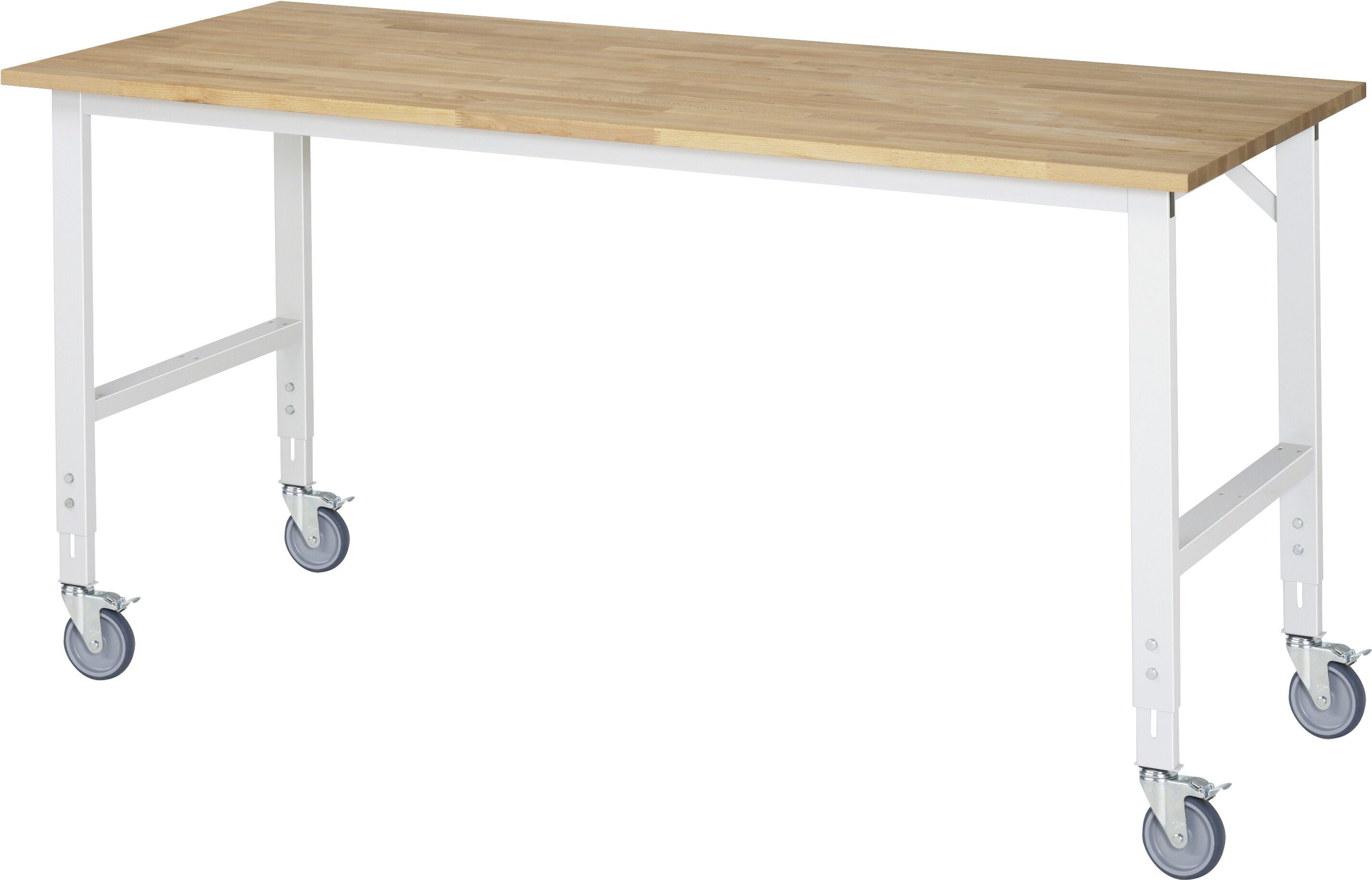 Fahrbarer Arbeitstisch Tom (verstellbar) B2000 x T800 x H910-1230 mm Buche-Massiv-Arbeitsplatte, Stärke 25 mm. Gestell Vierkantrohr. 4 Lenkrollen mit Feststeller Pulverbeschichtung Flächenlast max. 450 kg Lieferung zerlegt - einfachste Montage Qualitätsgarantie 5 Jahre Made in Germany