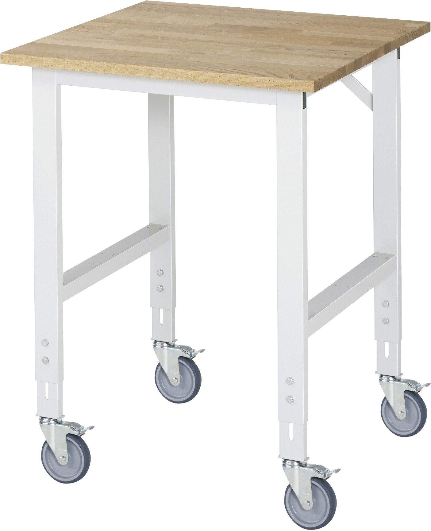 Fahrbarer Arbeitstisch Tom (verstellbar) B750 x T800 x H910-1230 mm Buche-Massiv-Arbeitsplatte, Stärke 25 mm. Gestell Vierkantrohr. 4 Lenkrollen mit Feststeller Pulverbeschichtung Flächenlast max. 450 kg Lieferung zerlegt - einfachste Montage Qualitätsgarantie 5 Jahre Made in Germany