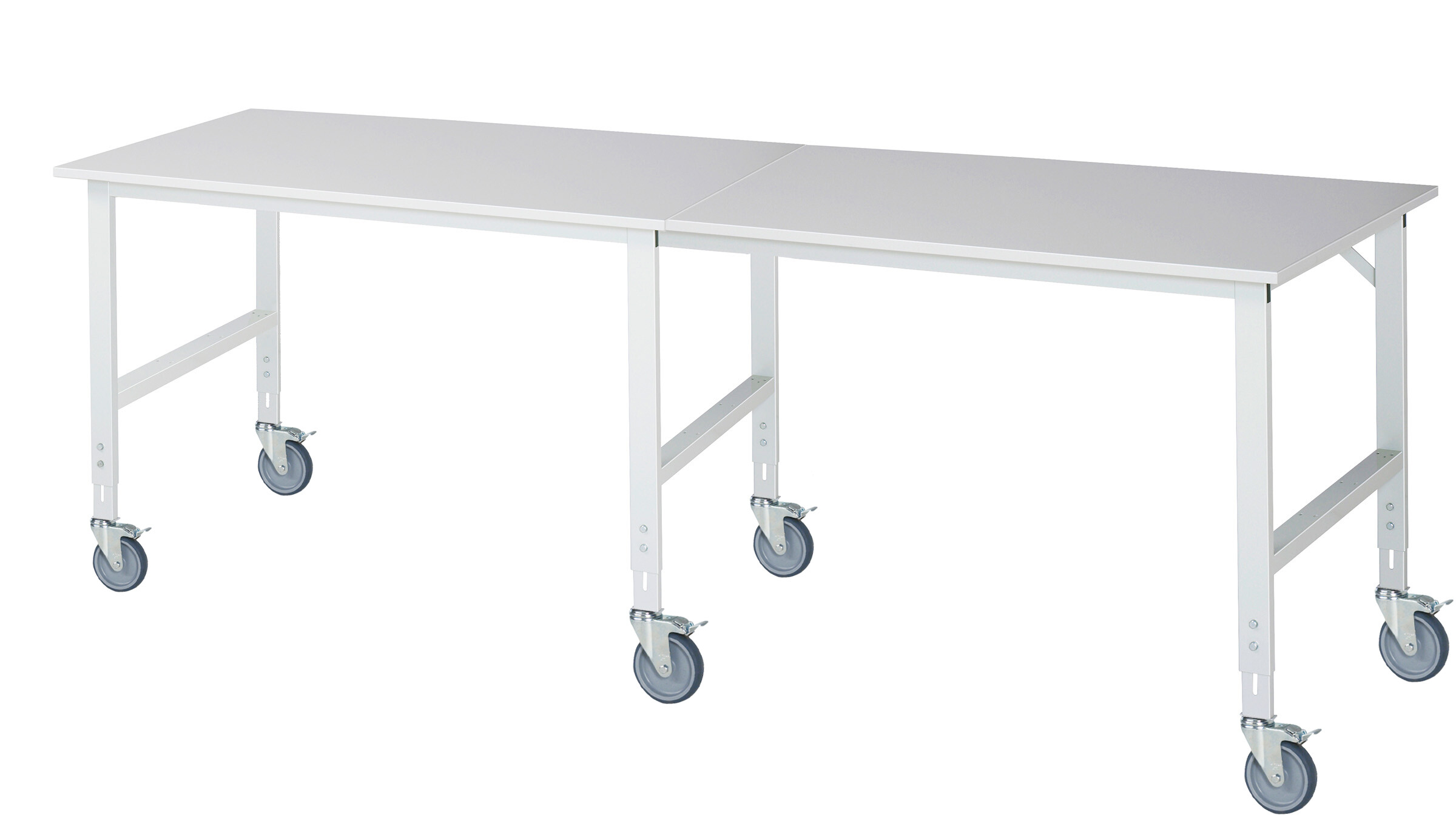 Fahrbarer Arbeitstisch Tom (verstellbar) B3000 x T1000 x H910-1230 mm Melaminharzbeschichtete-Platte 22 mm. Gestell Vierkantrohr. 6 Lenkrollen mit Feststeller Pulverbeschichtung Flächenlast max. 450 kg Lieferung zerlegt - einfachste Montage Qualitätsgarantie 5 Jahre Made in Germany