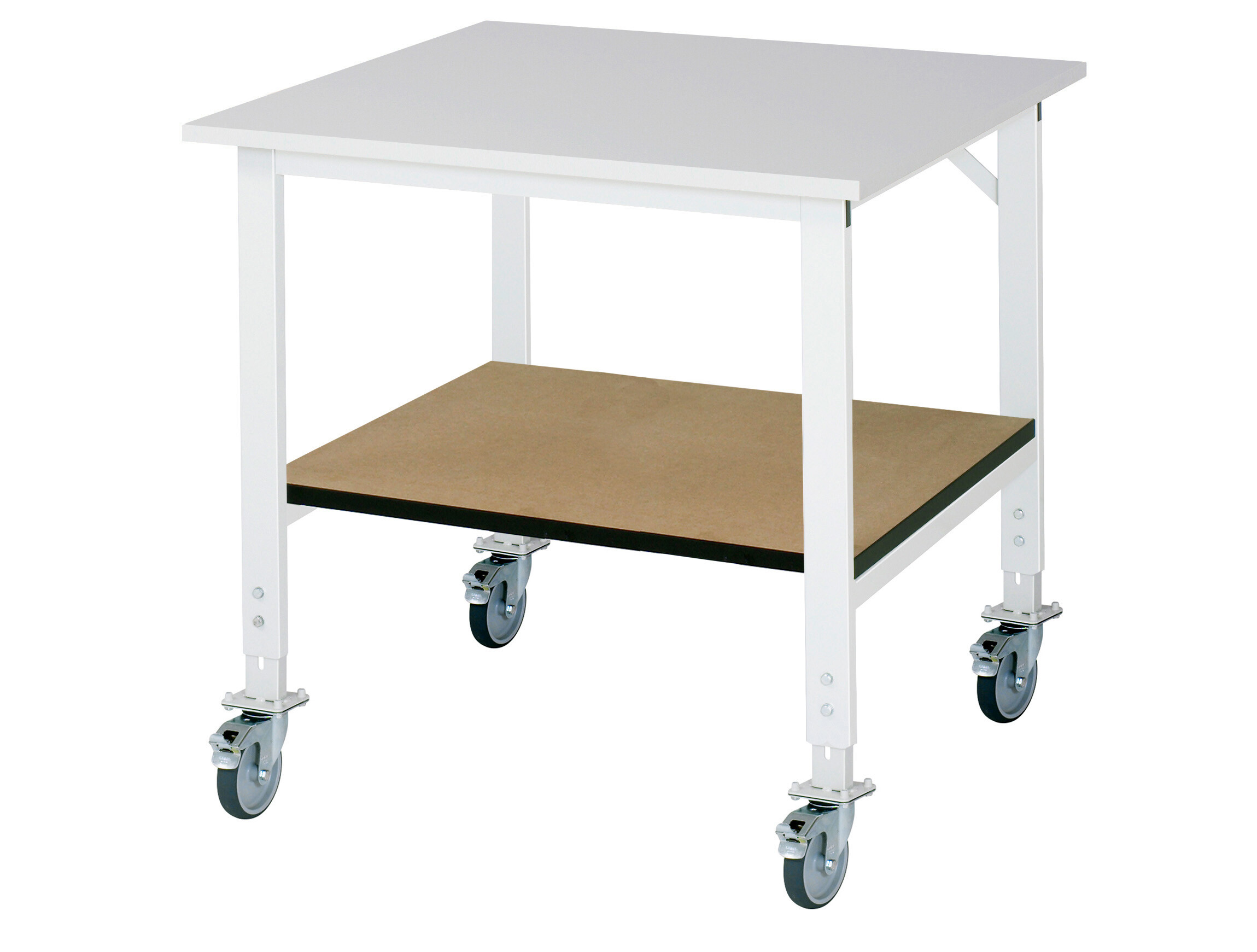 Arbeitstisch Serie Tom (K-Modell 01) B1000 x T1000 x H910-1230 mm Melamin-Platte 22 mm. Gestell 60x30 mm, Arbeitshöhe verstellbar. Ablageboden MDF. Pulverbeschichtung Flächenlast max. 450 kg Lieferung zerlegt - einfachste Montage Qualitätsgarantie 5 Jahre Made in Germany
