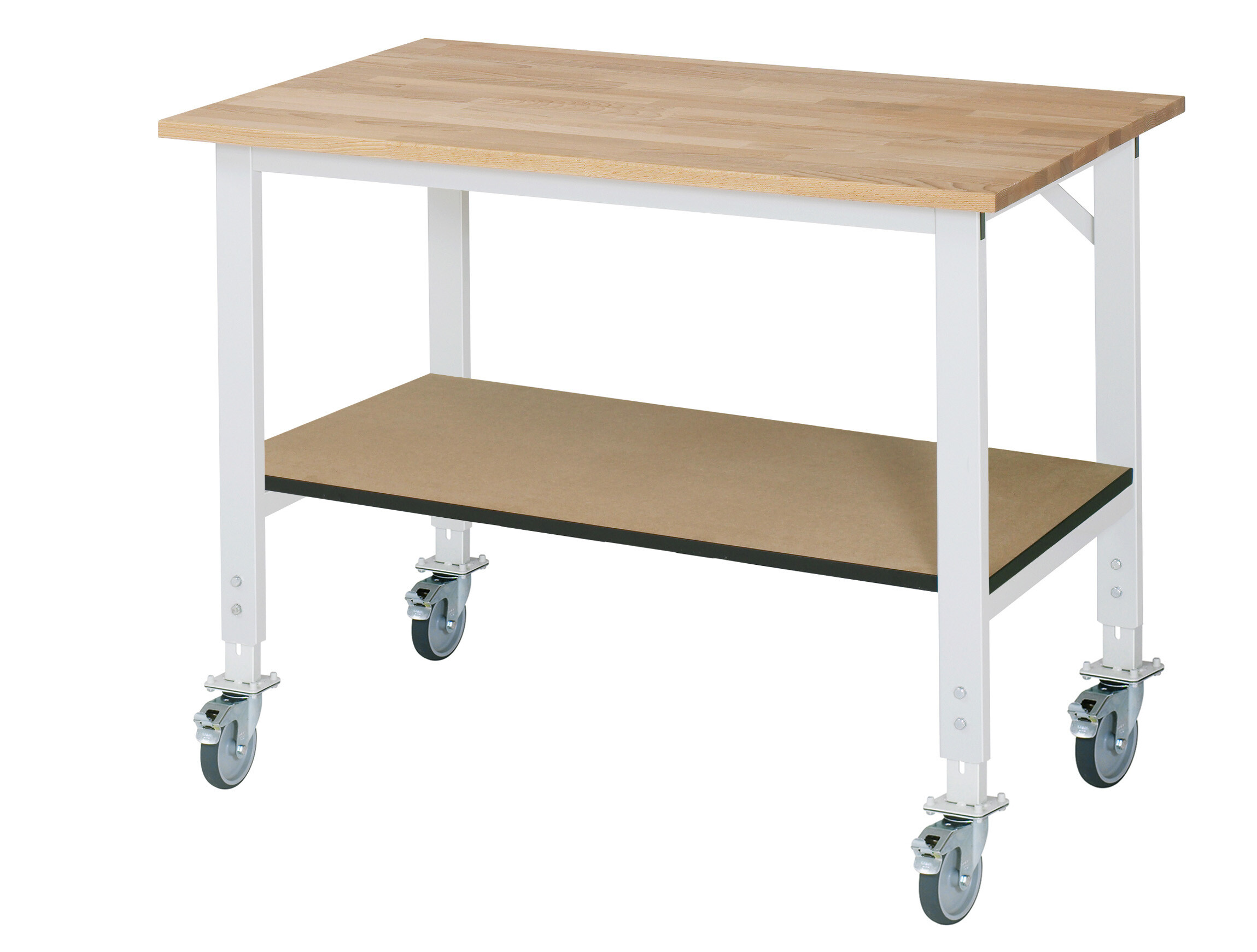 Arbeitstisch Serie Tom (K-Modell 01) B1250 x T800 x H910-1230 mm Buche-Massiv-Platte 25 mm. Gestell 60x30 mm, Arbeitshöhe verstellbar. Ablageboden MDF. Rollensatz (4 Lenkrollen mit Feststeller). Pulverbeschichtung Flächenlast max. 450 kg Lieferung zerlegt - einfachste Montage Qualitätsgarantie 5 Jahre Made in Germany