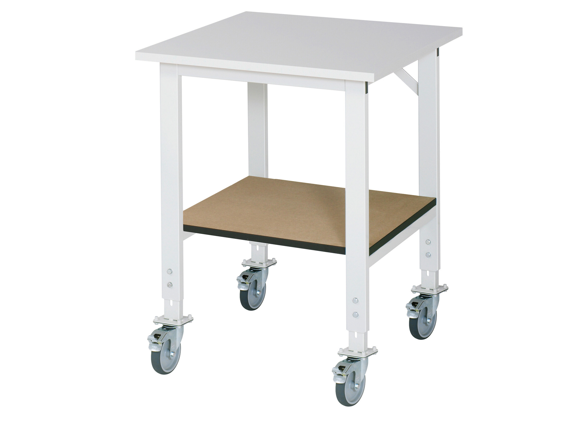 Arbeitstisch Serie Tom (K-Modell 01) B750 x T800 x H910-1230 mm Melaminharzbeschichtete-Platte 22 mm. Gestell 60x30 mm, Arbeitshöhe verstellbar. Ablageboden MDF. Rollensatz (4 Lenkrollen mit Feststeller). Pulverbeschichtung Flächenlast max. 450 kg Lieferung zerlegt - einfachste Montage Qualitätsgarantie 5 Jahre Made in Germany