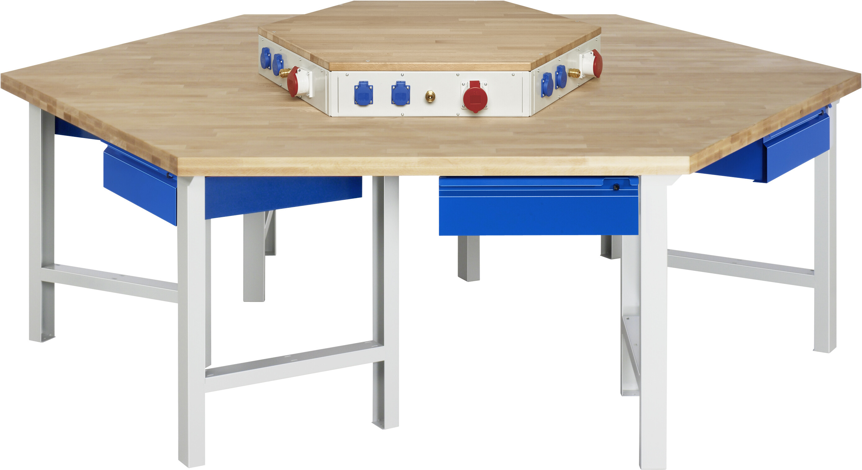 Gruppenwerkbank 4000 - Modell 401 BASIC B2700 x T2340 x H790-1140 mm Buche-Massiv-Arbeitsplatte 40 mm. Werkbank mit einstellbarer Arbeitshöhe. 6 x je 1 Schublade auf rollengelagerten Auszugsschienen (1xH150 mm). Energieaufsatz. Pulverbeschichtung Flächenlast max. 750 kg Lieferung zerlegt Qualitätsgarantie 5 Jahre Made in Germany