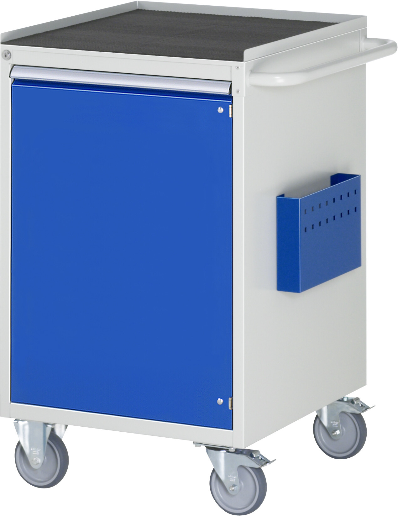 Montagewagen Serie 7000 B580 x T650 x H975 mm Metall-Top 25 mm. 1 x Flügeltür (H720 mm mit Fachboden höhenverstellbar) 2 Bock- und 2 Lenkrollen mit Feststeller. Pulverbeschichtung Belastbarkeit gesamt max. 450 kg Lieferung komplett montiert Qualitätsgarantie 5 Jahre Made in Germany