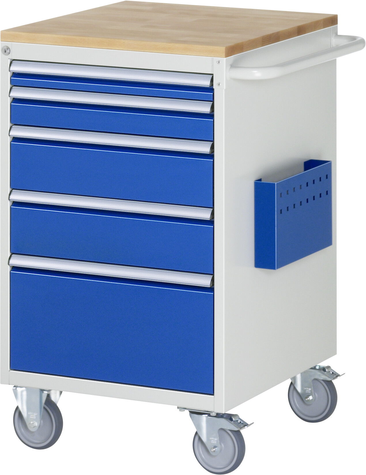 Montagewagen Serie 7000 B580 x T650 x H975 mm Buche-Top 25 mm. 5 x Schublade (1xH60, 1xH90, 2xH150, 1xH270 mm). 2 Bock- und 2 Lenkrollen mit Feststeller. Pulverbeschichtung Belastbarkeit gesamt max. 450 kg Lieferung komplett montiert Qualitätsgarantie 5 Jahre Made in Germany