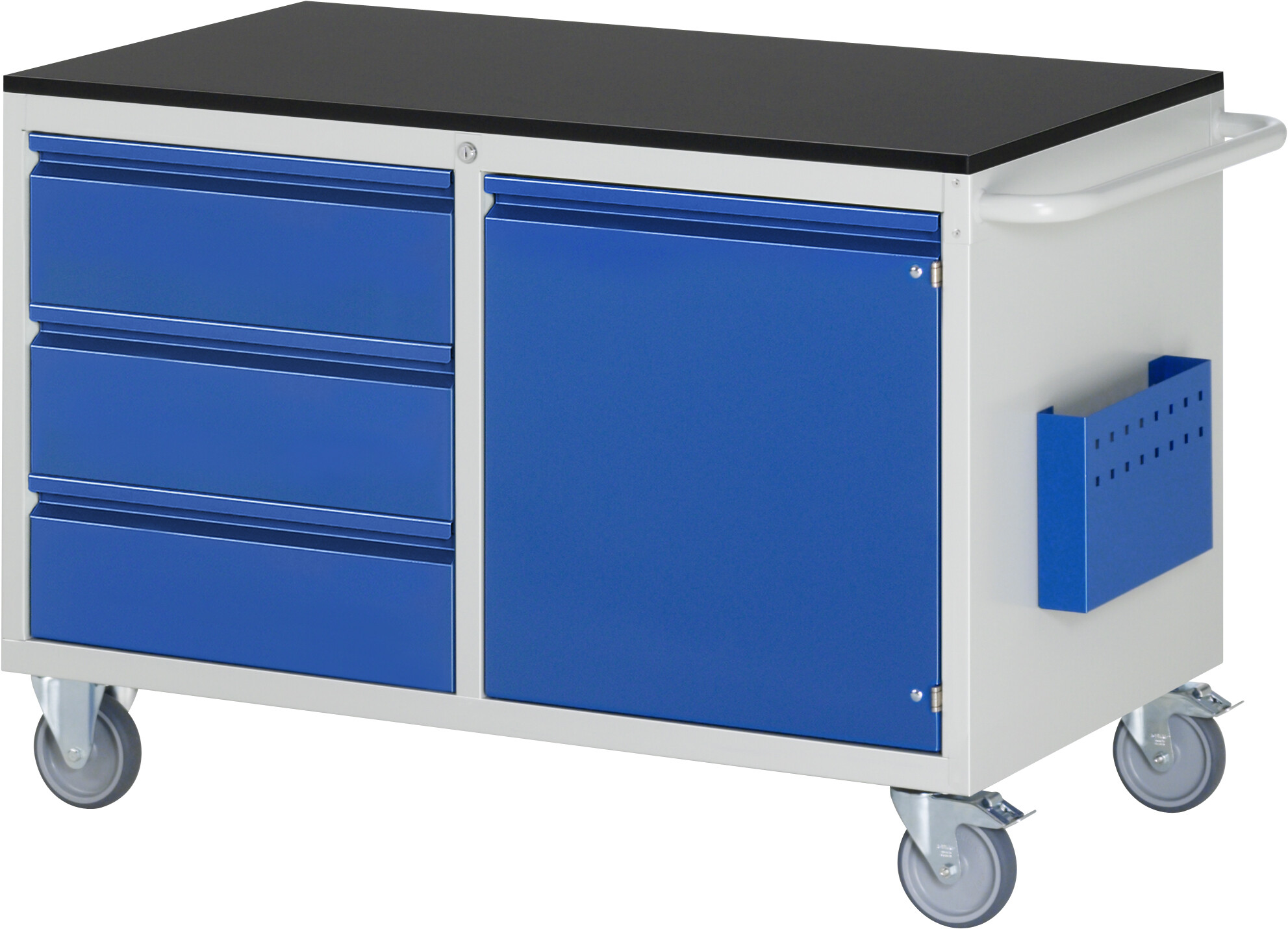 Montagewagen Serie 7000 BASIC B1145 x T650 x H790 mm Buche-Top 25 mm. 3 x Schublade auf rollengelagerten Auszugsschienen (3xH180 mm). 1 x Flügeltür (H540 mm mit Fachboden höhenverstellbar). Pulverbeschichtung Belastbarkeit gesamt max. 450 kg Lieferung komplett montiert Qualitätsgarantie 5 Jahre Made in Germany