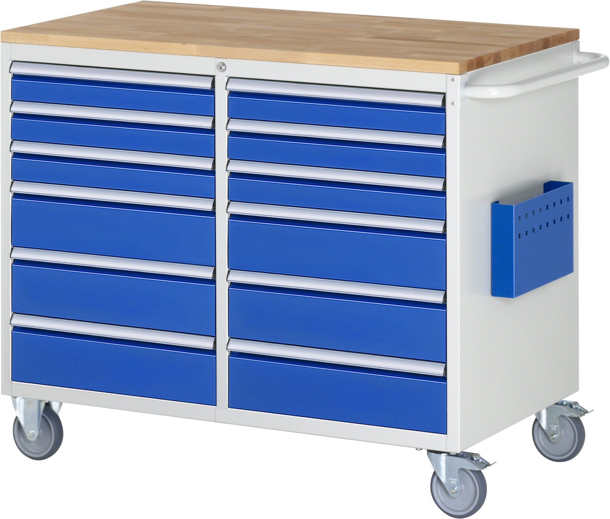 Montagewagen Serie 7000 B1145 x T650 x H975 mm Buche-Top 25 mm. 12 x Schublade (6xH90, 6xH150 mm). 2 Bock- und 2 Lenkrollen mit Feststeller. Pulverbeschichtung Belastbarkeit gesamt max. 450 kg Lieferung komplett montiert Qualitätsgarantie 5 Jahre Made in Germany