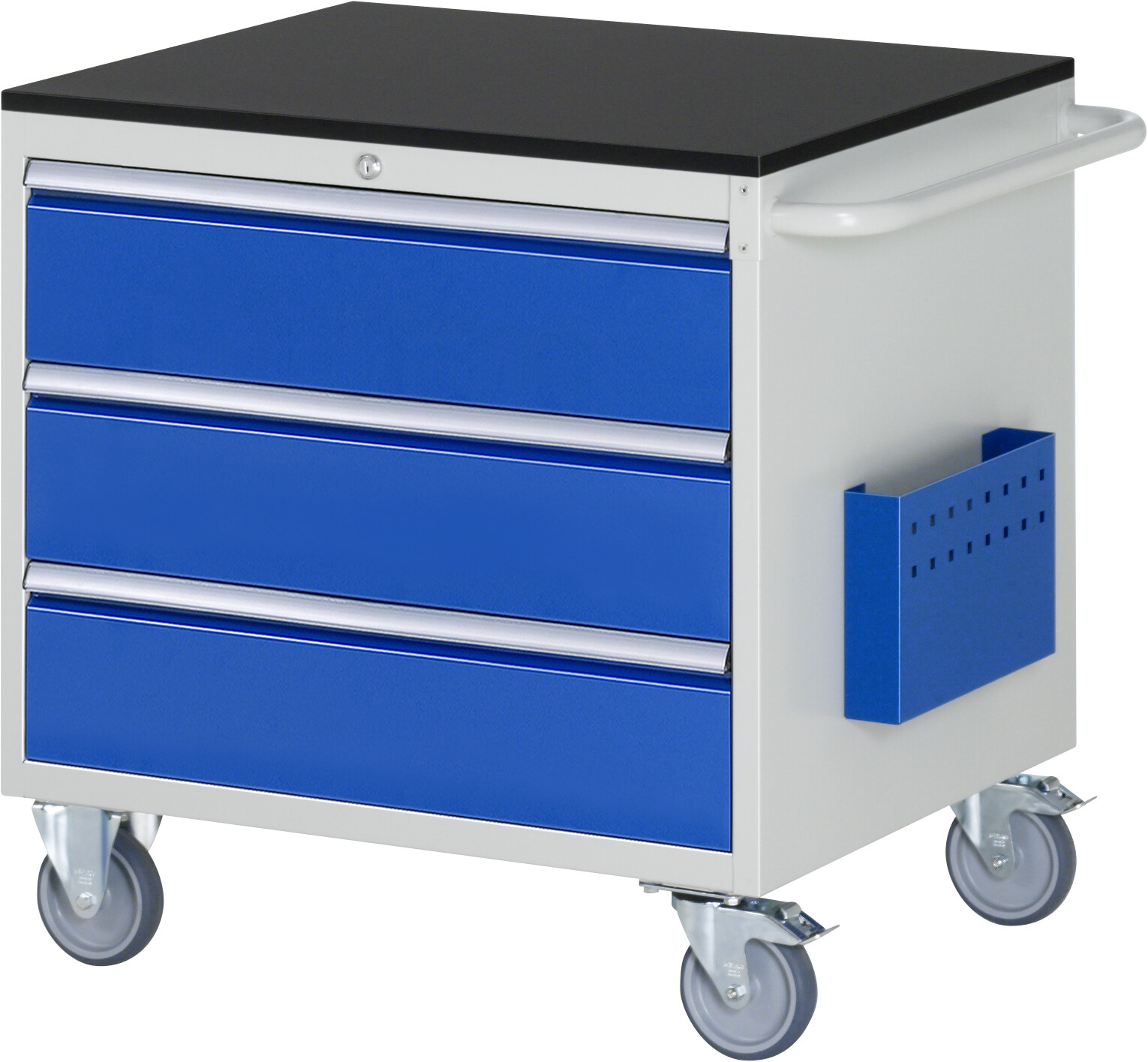 Montagewagen Serie 7000 B770 x T650 x H790 mm Melamin-Top 19 mm. 3 x Schublade (3xH180 mm). 2 Bock- und 2 Lenkrollen mit Feststeller. Pulverbeschichtung Belastbarkeit gesamt max. 450 kg Lieferung komplett montiert Qualitätsgarantie 5 Jahre Made in Germany