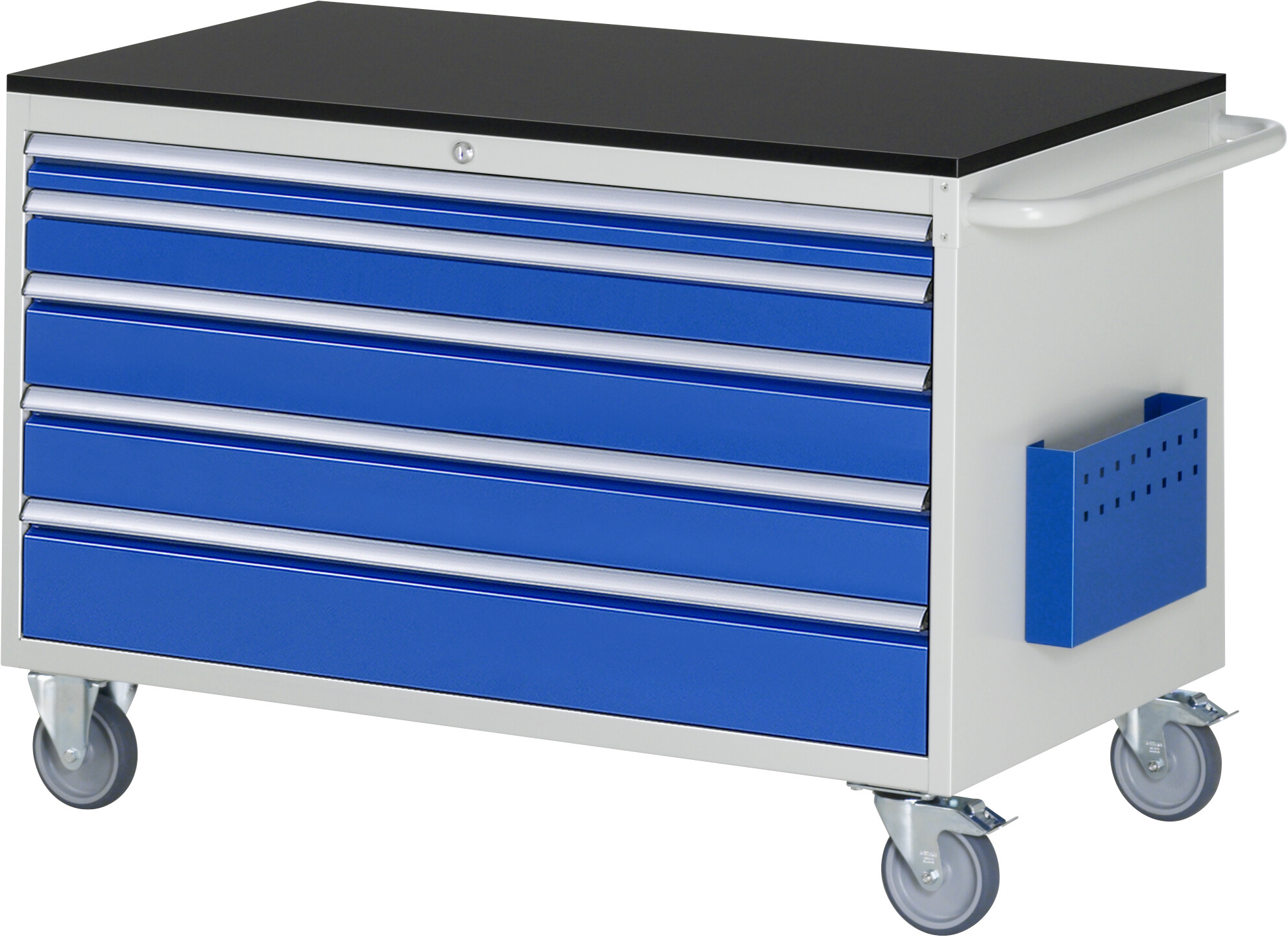 Montagewagen Serie 7000 B1145 x T650 x H790 mm Melamin-Top 19 mm. 5 x Schublade (1xH60, 1xH90, 2xH120, 1xH150 mm). 2 Bock- und 2 Lenkrollen mit Feststeller. Pulverbeschichtung Belastbarkeit gesamt max. 450 kg Lieferung komplett montiert Qualitätsgarantie 5 Jahre Made in Germany
