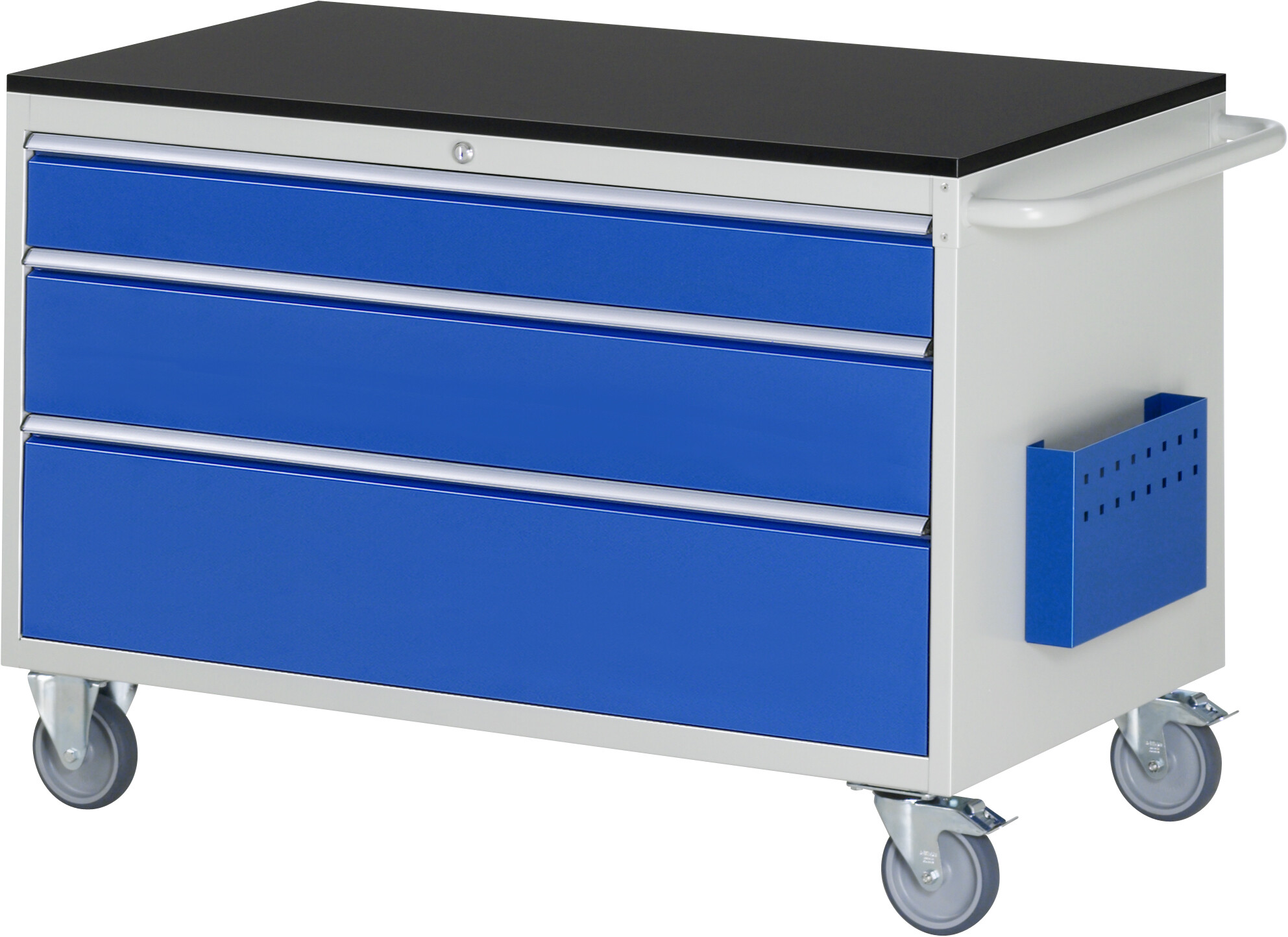 Montagewagen Serie 7000 B1145 x T650 x H790 mm Melamin-Top 19 mm. 3 x Schublade (1xH120, 1xH180, 1xH240 mm). 2 Bock- und 2 Lenkrollen mit Feststeller. Pulverbeschichtung Belastbarkeit gesamt max. 450 kg Lieferung komplett montiert Qualitätsgarantie 5 Jahre Made in Germany
