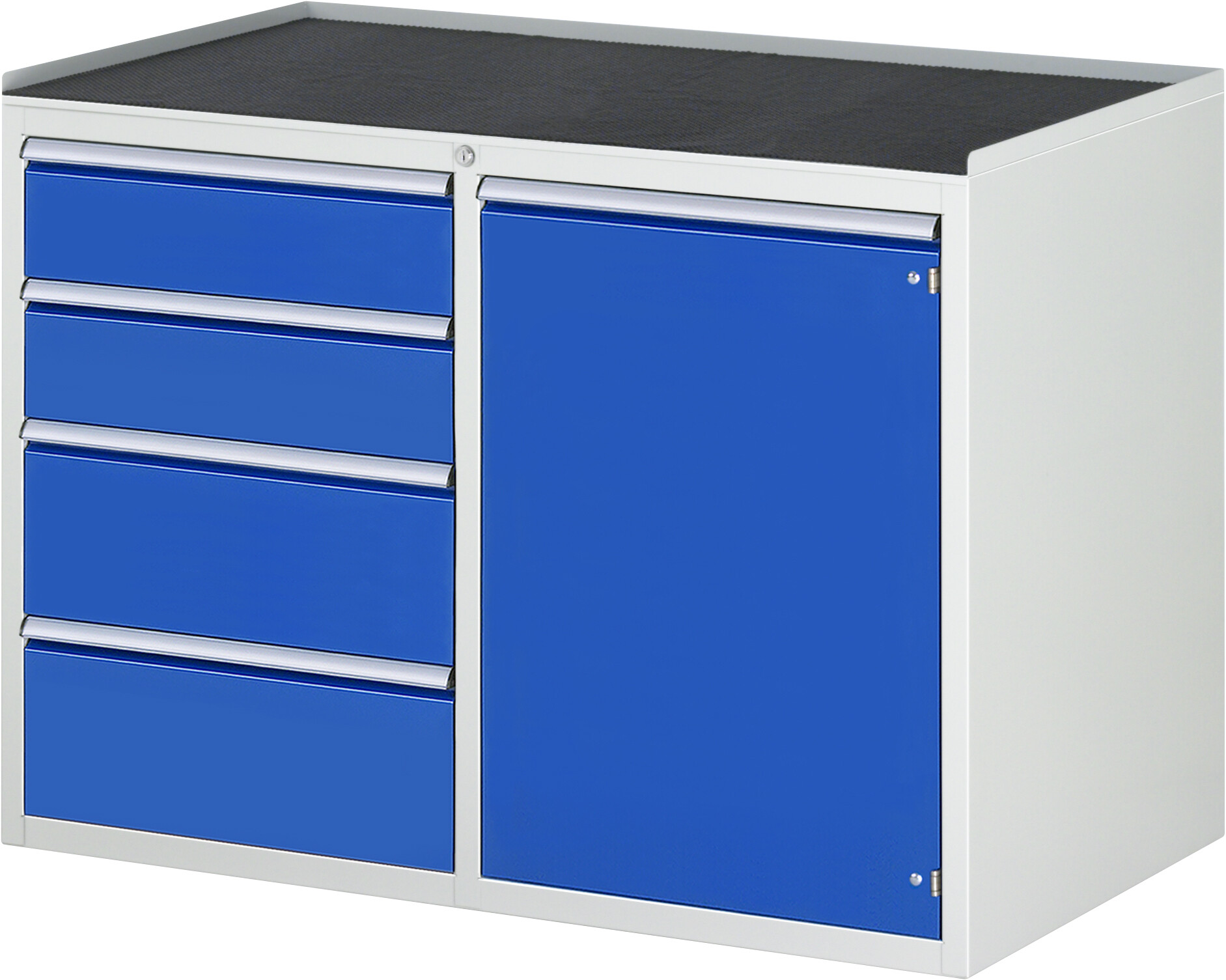 Schubladenschrank Serie 7000 B1145 x T650 x H825 mm Metall-Top 25 mm. 4 x Schublade (2xH150, 2xH210 mm). 1 x Flügeltür (H720 mm mit Fachboden höhenverstellbar). Pulverbeschichtung Flächenlast max. 750 kg Lieferung komplett montiert Qualitätsgarantie 5 Jahre Made in Germany