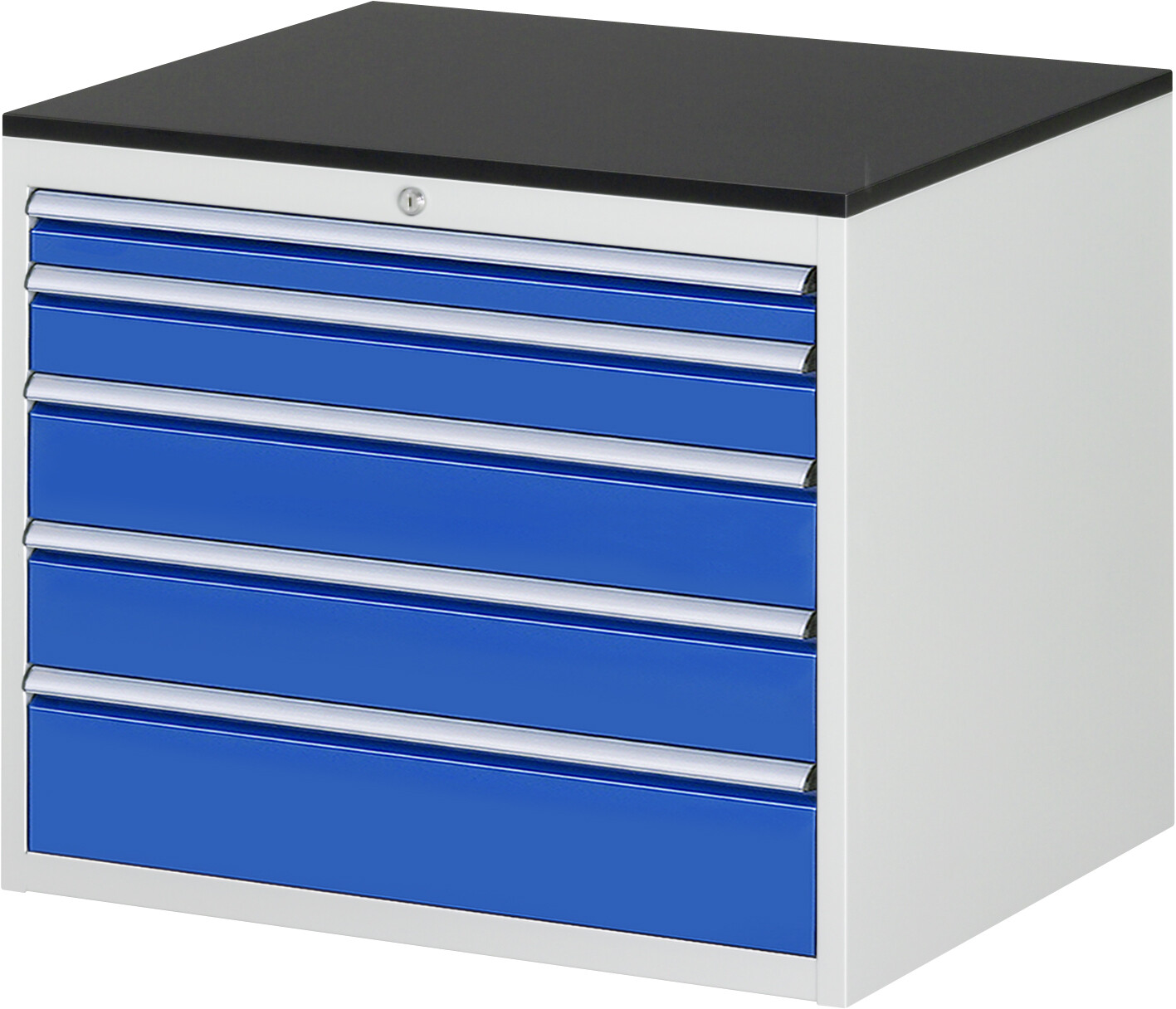 Schubladenschrank Serie 7000 B770 x T650 x H640 mm Melamin-Top 19 mm. 5 x Schublade (1xH60, 1xH90, 2xH120, 1xH150 mm). Pulverbeschichtung Flächenlast max. 750 kg Lieferung komplett montiert Qualitätsgarantie 5 Jahre Made in Germany