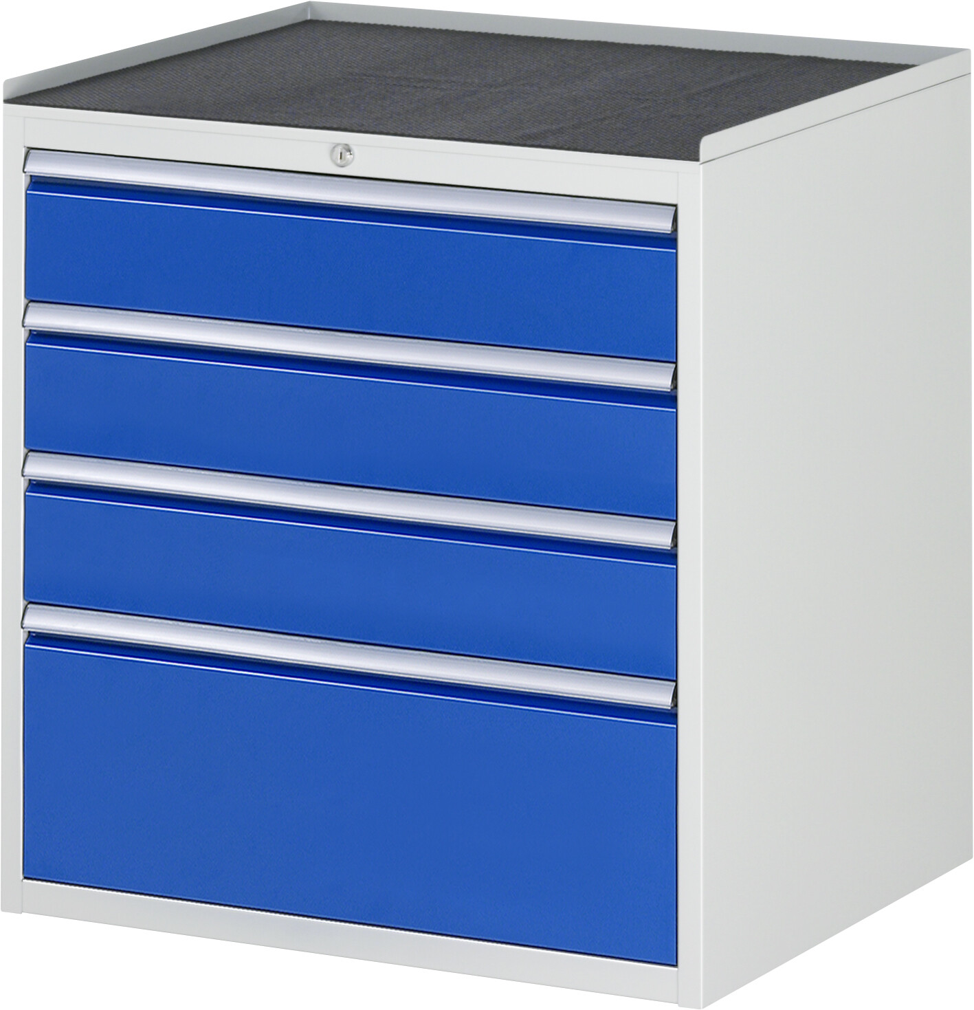 Schubladenschrank Serie 7000 B770 x T650 x H825 mm Metall-Top 25 mm. 4 x Schublade (3xH150, 1xH270 mm). Pulverbeschichtung Flächenlast max. 750 kg Lieferung komplett montiert Qualitätsgarantie 5 Jahre Made in Germany