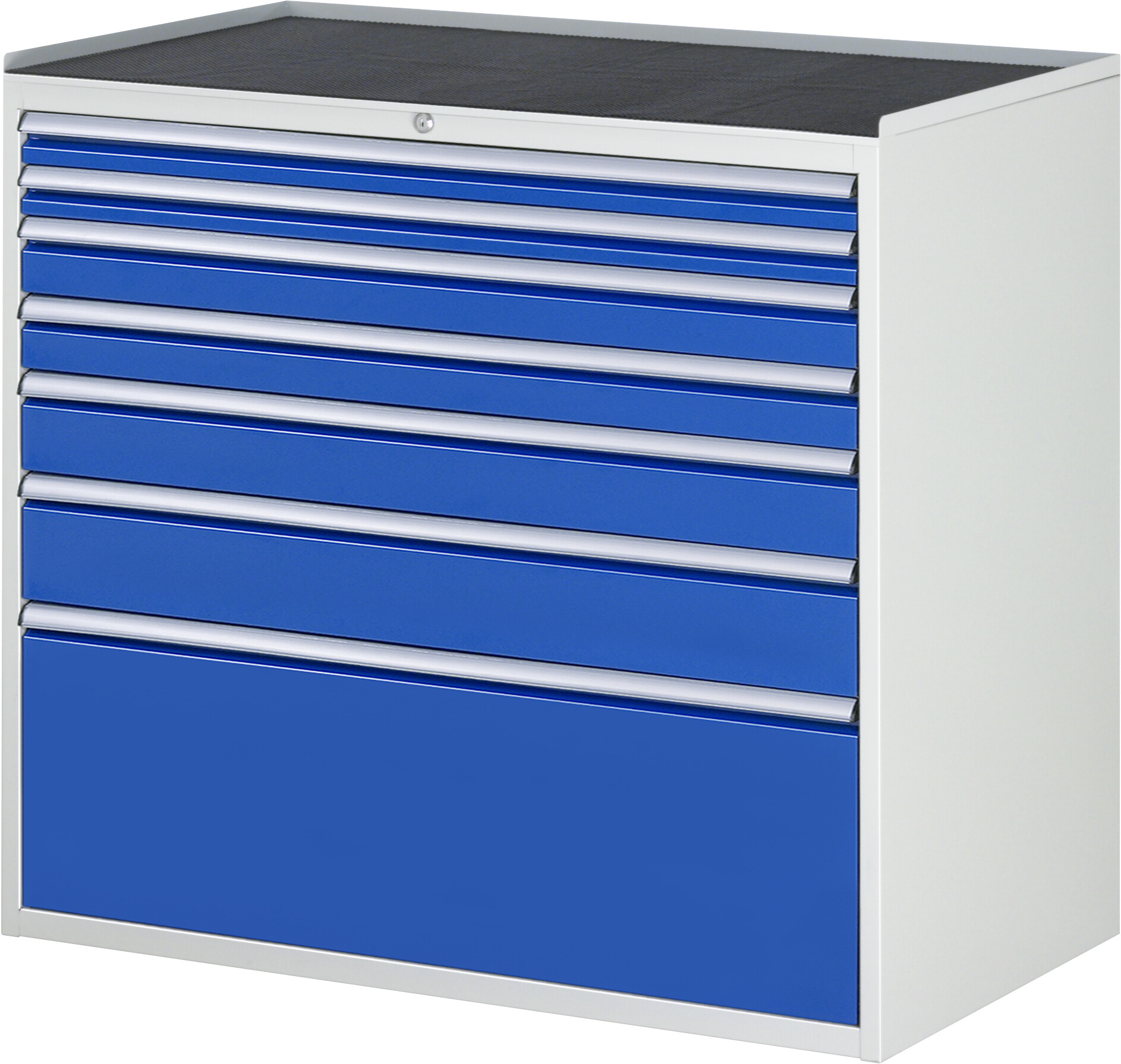 Schubladenschrank Serie 7000 B1145 x T650 x H1035 mm Metall-Top 25 mm. 7 x Schublade (2xH60, 2xH90, 1xH120, 1xH150, 1xH360 mm). Pulverbeschichtung Flächenlast max. 750 kg Lieferung komplett montiert Qualitätsgarantie 5 Jahre Made in Germany