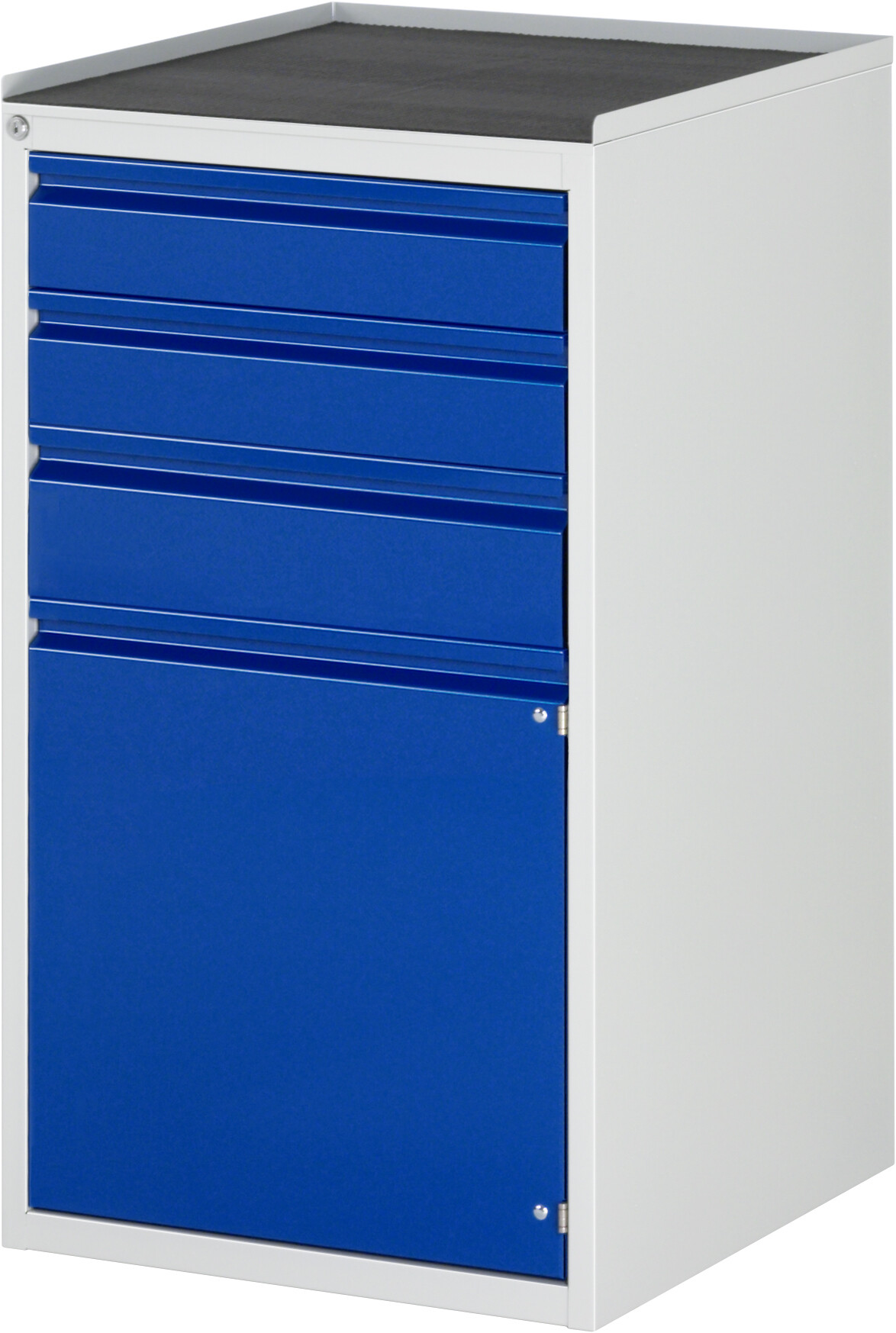 Schubladenschrank Serie 7000 BASIC B580 x T650 x H1035 mm Metall-Top 25 mm. 3 x Schublade auf rollengelagerten Auszugsschienen (2xH120, 1xH150 mm). 1 x Flügeltür (H540 mm mit Fachboden höhenverstellbar). Pulverbeschichtung Flächenlast max. 750 kg Lieferung komplett montiert Qualitätsgarantie 5 Jahre Made in Germany