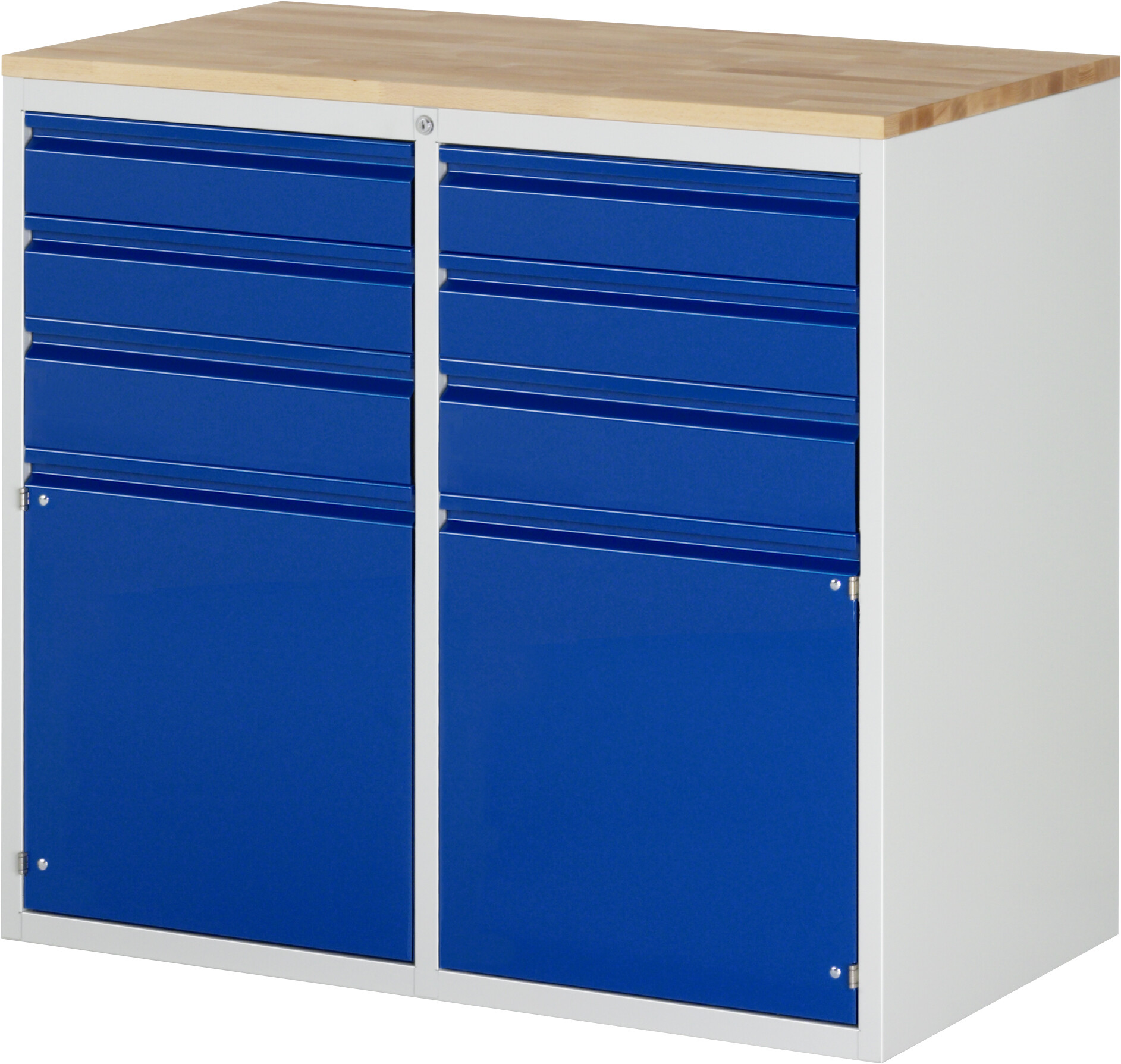 Schubladenschrank Serie 7000 BASIC B1145 x T650 x H1035 mm Buche-Top 25 mm. 6 x Schublade auf rollengelagerten Auszugsschienen (4xH120, 2xH150 mm). 2 x Flügeltür (H540 mm mit Fachboden höhenverstellbar). Pulverbeschichtung Flächenlast max. 750 kg Lieferung komplett montiert Qualitätsgarantie 5 Jahre Made in Germany
