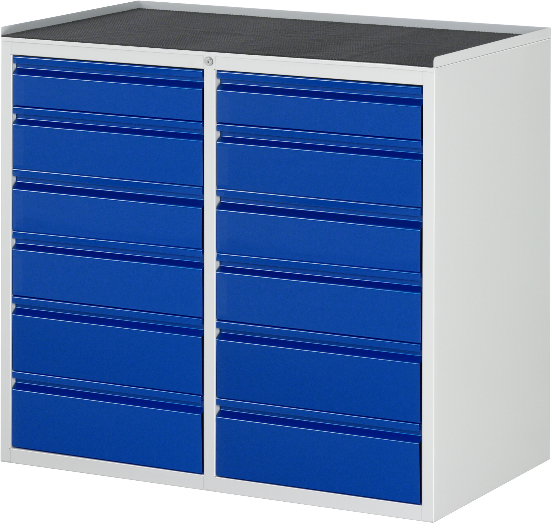 Schubladenschrank Serie 7000 BASIC B1145 x T650 x H1035 mm Metall-Top 25 mm. 12 x Schublade auf rollengelagerten Auszugsschienen (2xH120, 6xH150, 4xH180 mm). Pulverbeschichtung Flächenlast max. 750 kg Lieferung komplett montiert Qualitätsgarantie 5 Jahre Made in Germany