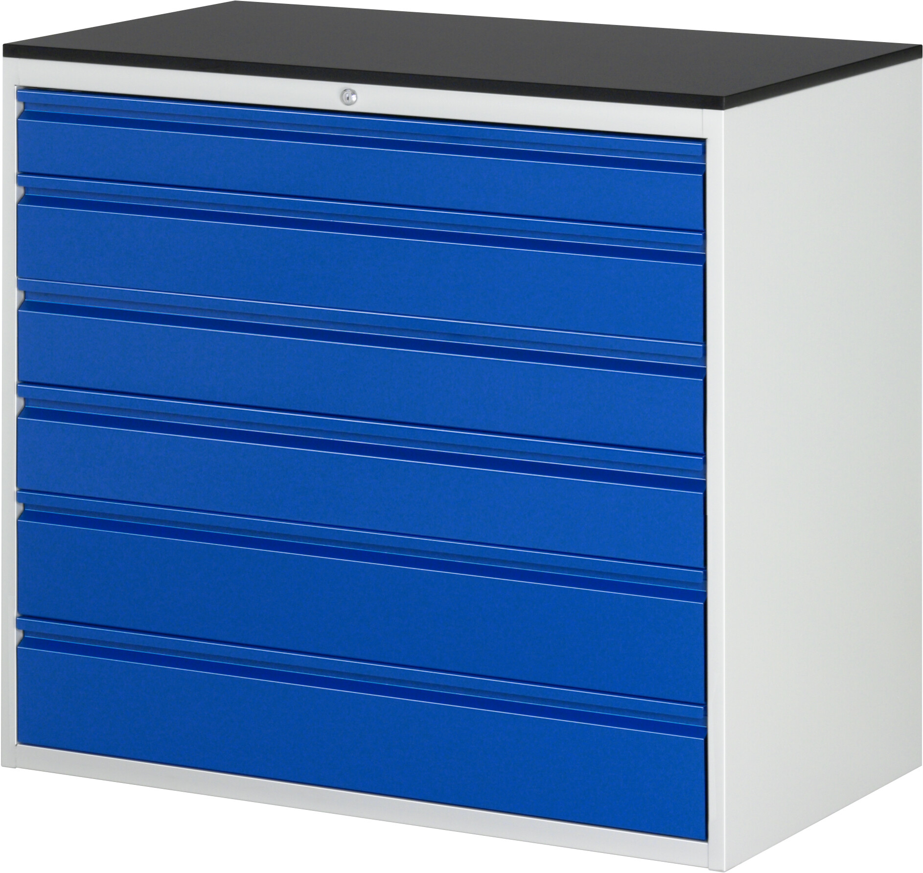Schubladenschrank Serie 7000 BASIC B1145 x T650 x H1030 mm Melamin-Top 20 mm. 6 x Schublade-XXL auf rollengelagerten Auszugsschienen (1xH120, 3xH150, 2xH180 mm). Pulverbeschichtung Flächenlast max. 750 kg Lieferung komplett montiert Qualitätsgarantie 5 Jahre Made in Germany