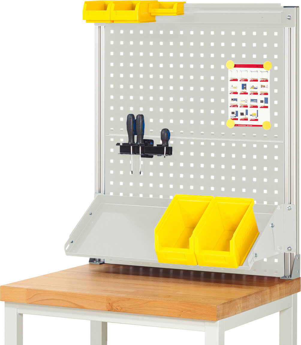 System-Aufbau (Komplettset-02 B750 mm) B750 x T350 x H900 mm Bestehend aus: System-Stützen, Metallablage, 2 x Lochplatte und Halteschiene Pulverbeschichtung Lieferung zerlegt - einfachste Montage Qualitätsgarantie 5 Jahre Made in Germany