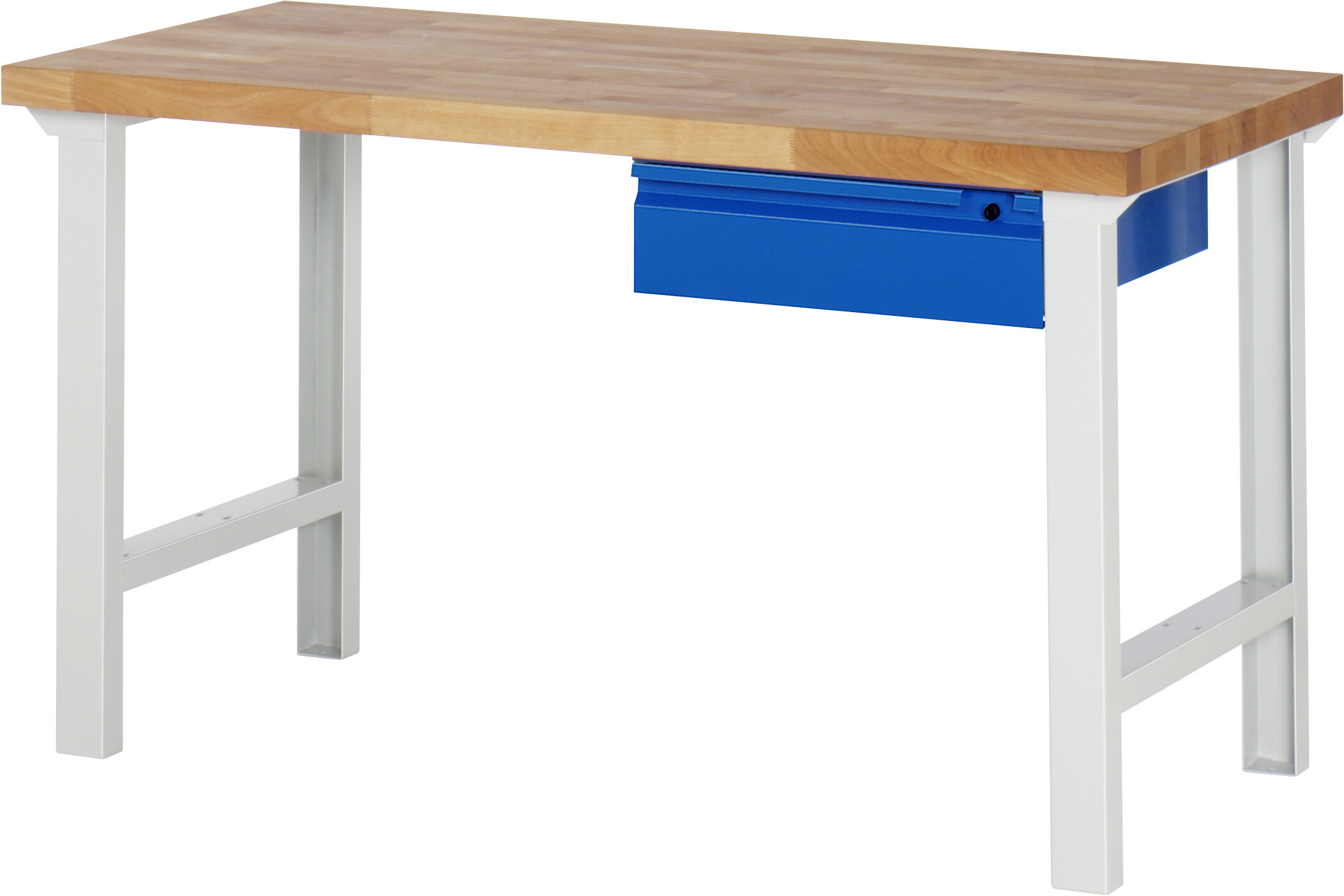 Werkbank Serie 7000 - Modell 7001 BASIC B1500 x T700 x H840 mm Buche-Massiv-Arbeitsplatte 40 mm. 1 x Schublade auf rollengelagerten Auszugsschienen (1xH150 mm). Pulverbeschichtung Flächenlast max. 750 kg Lieferung komplett montiert Qualitätsgarantie 5 Jahre Made in Germany