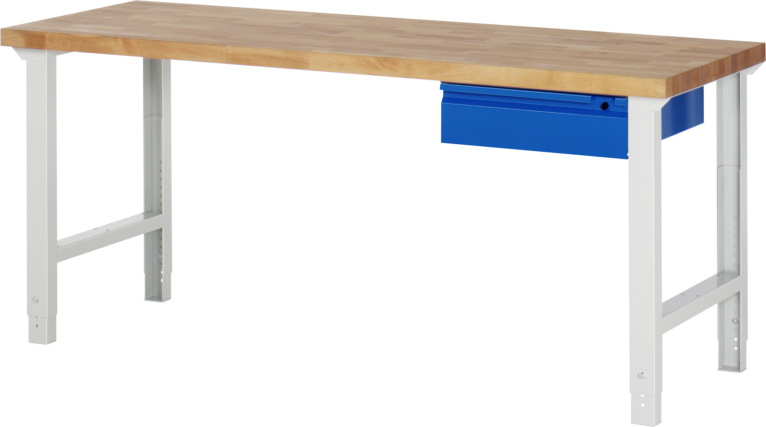 Werkbank Serie 7000 - Modell 7001 BASIC B2000 x T700 x H790-1140 mm Buche-Massiv-Arbeitsplatte 40 mm. Werkbank mit einstellbarer Arbeitshöhe. 1 x Schublade auf rollengelagerten Auszugsschienen (1xH150 mm). Pulverbeschichtung Flächenlast max. 750 kg Lieferung komplett montiert Qualitätsgarantie 5 Jahre Made in Germany