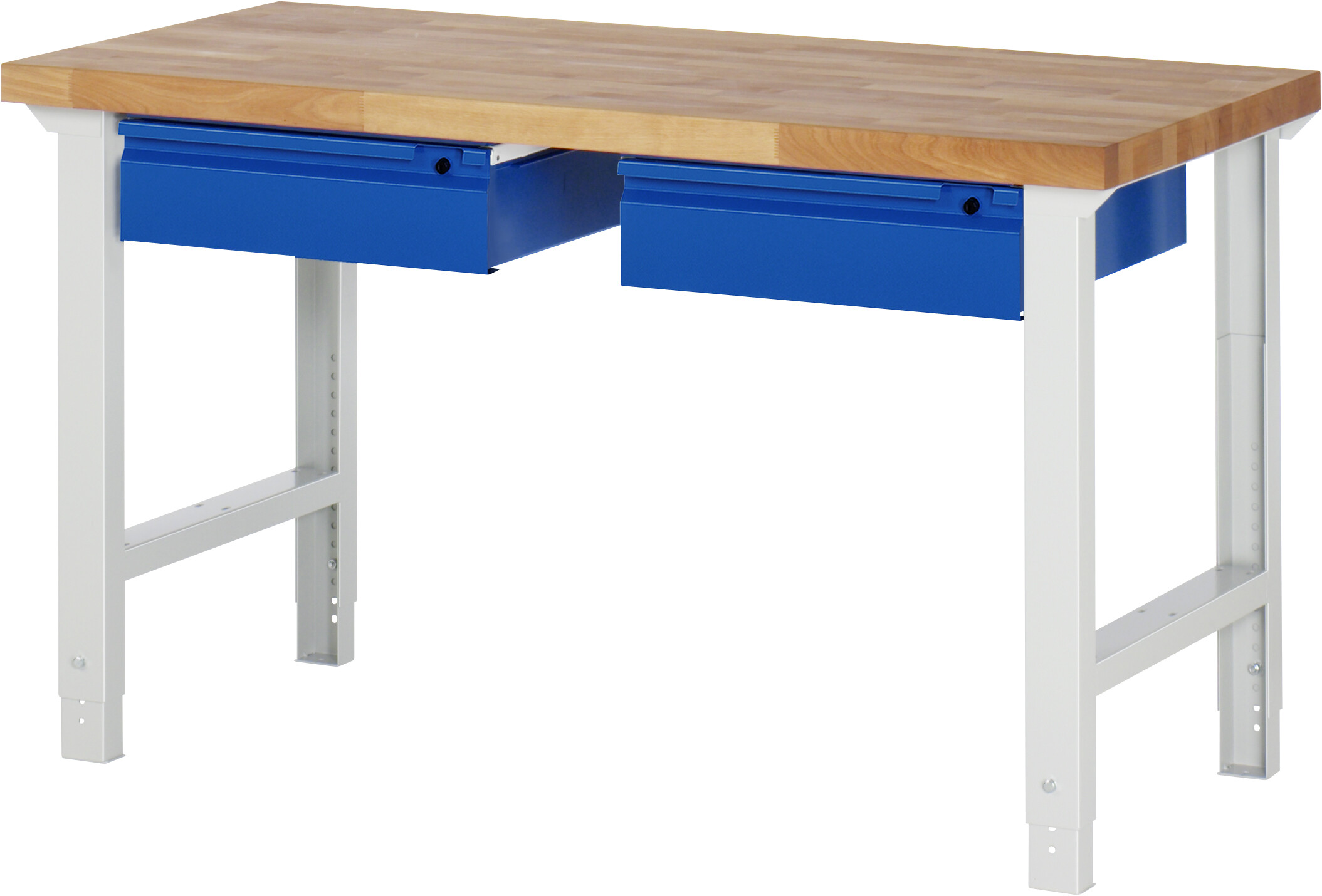 Werkbank Serie 7000 - Modell 7002 BASIC B1500 x T700 x H790-1140 mm Buche-Massiv-Arbeitsplatte 40 mm. Werkbank mit einstellbarer Arbeitshöhe. 2 x Schublade auf rollengelagerten Auszugsschienen (2xH150 mm). Pulverbeschichtung Flächenlast max. 750 kg Lieferung komplett montiert Qualitätsgarantie 5 Jahre Made in Germany