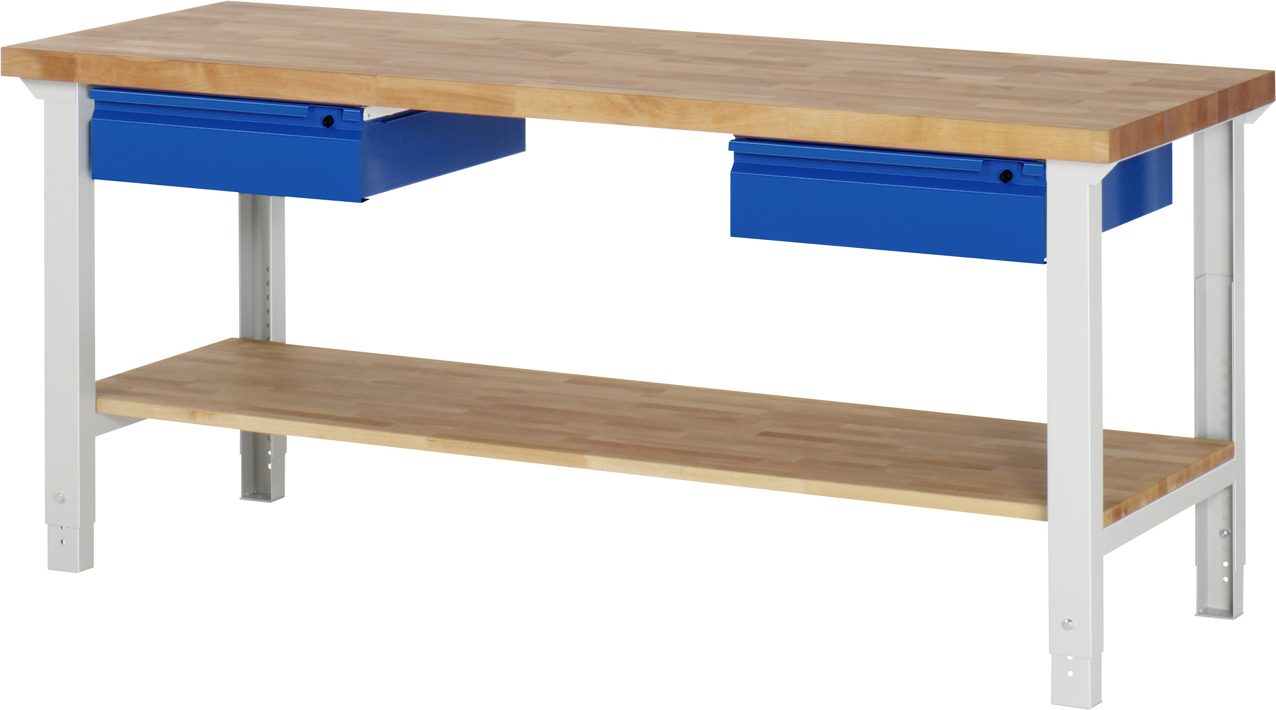 Werkbank Serie 7000 - Modell 7002 BASIC B2000 x T700 x H790-1140 mm Buche-Massiv-Arbeitsplatte 40 mm. Werkbank mit Buche-Massiv-Ablageboden (T 545 mm) und einstellbarer Arbeitshöhe. 2 x Schublade auf rollengelagerten Auszugsschienen (2xH150 mm). Pulverbeschichtung Flächenlast max. 750 kg Lieferung komplett montiert Qualitätsgarantie 5 Jahre Made in Germany