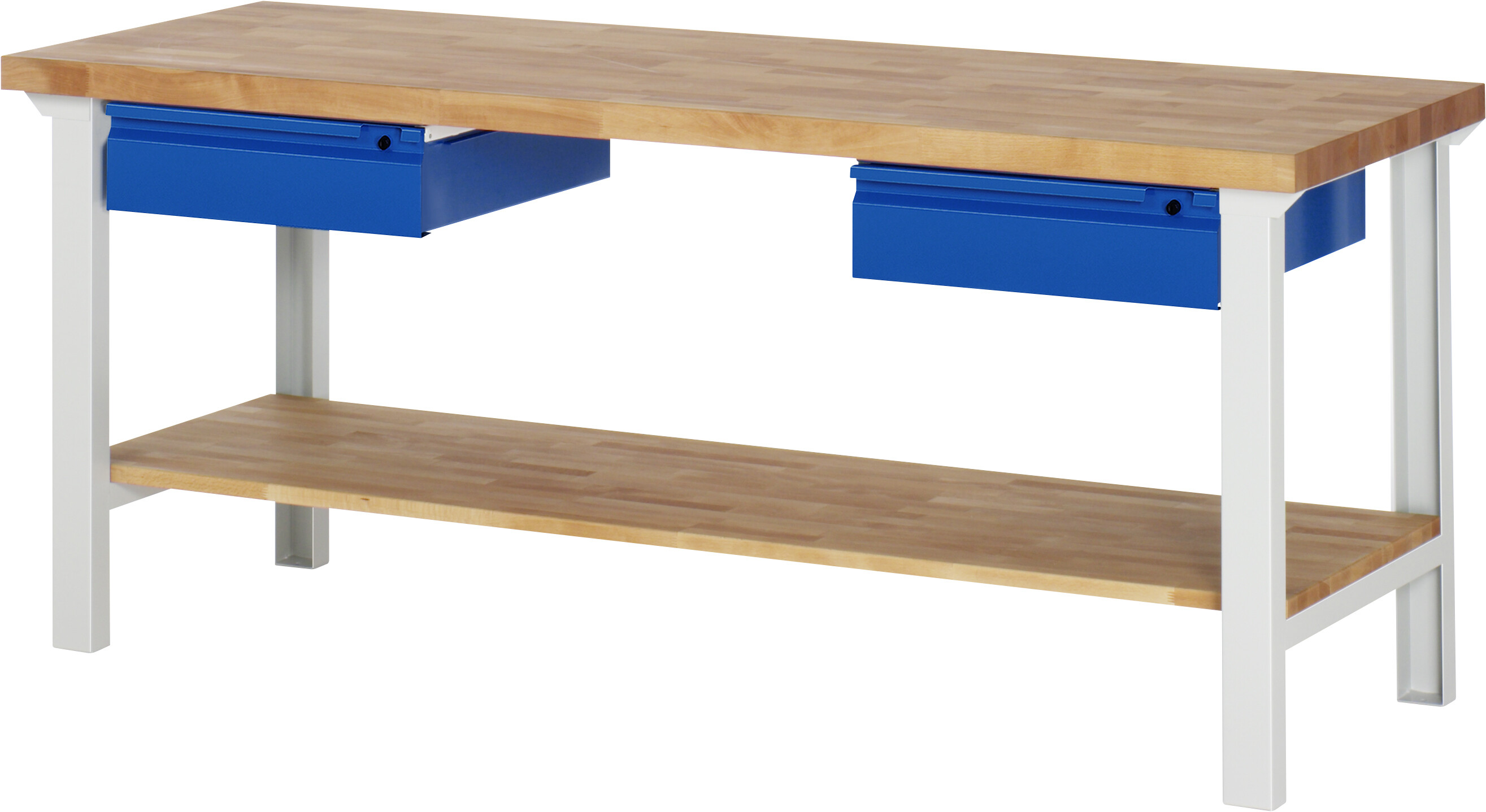 Werkbank Serie 7000 - Modell 7002 BASIC B2000 x T700 x H840 mm Buche-Massiv-Arbeitsplatte 40 mm. Werkbank mit Buche-Massiv-Ablageboden (T 545 mm). 2 x Schublade auf rollengelagerten Auszugsschienen (2xH150 mm). Pulverbeschichtung Flächenlast max. 750 kg Lieferung komplett montiert Qualitätsgarantie 5 Jahre Made in Germany