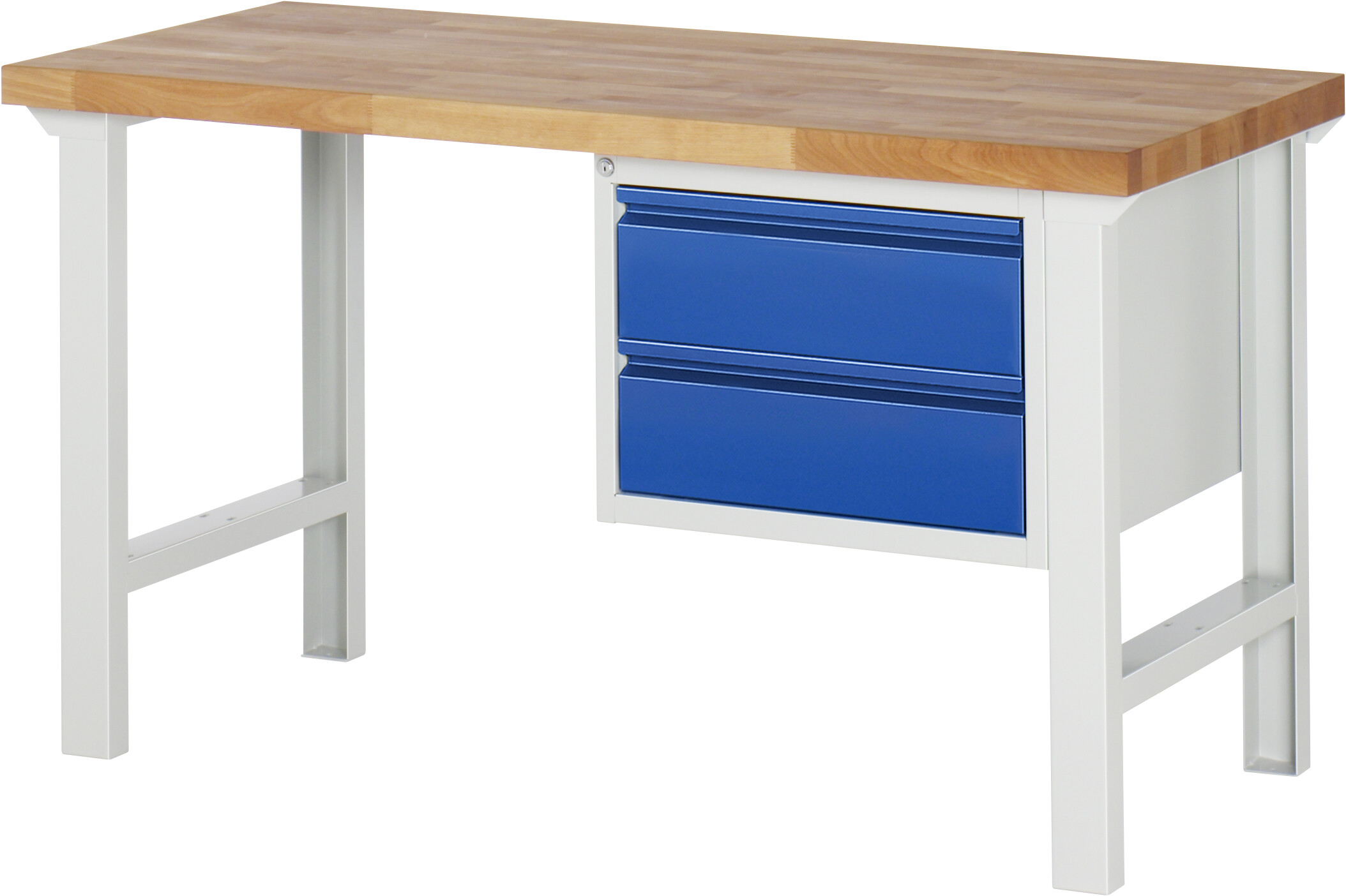 Werkbank Serie 7000 - Modell 7125 BASIC B1500 x T700 x H840 mm Buche-Massiv-Arbeitsplatte 40 mm. 2 x Schublade auf rollengelagerten Auszugsschienen (2xH180 mm). Pulverbeschichtung Flächenlast max. 750 kg Lieferung komplett montiert Qualitätsgarantie 5 Jahre Made in Germany