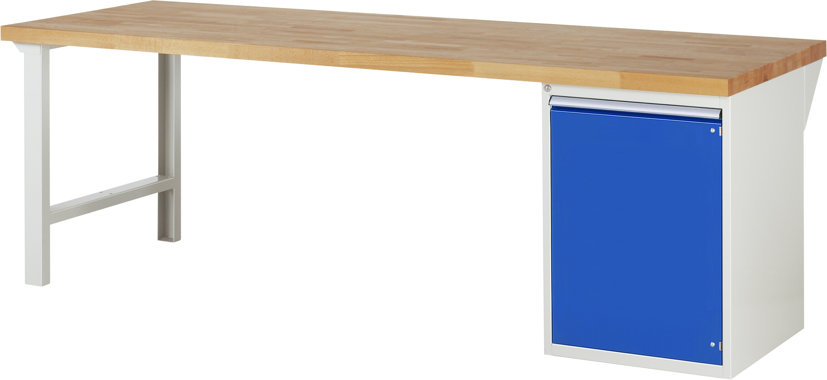 Werkbank Serie 7000 - Modell 7501 B2500 x T900 x H890 mm Buche-Massiv-Platte 40 mm. 1 x Flügeltür (H720 mm mit Fachboden höhenverstellbar). Pulverbeschichtung Flächenlast max. 1.000 kg Lieferung komplett montiert Qualitätsgarantie 5 Jahre Made in Germany