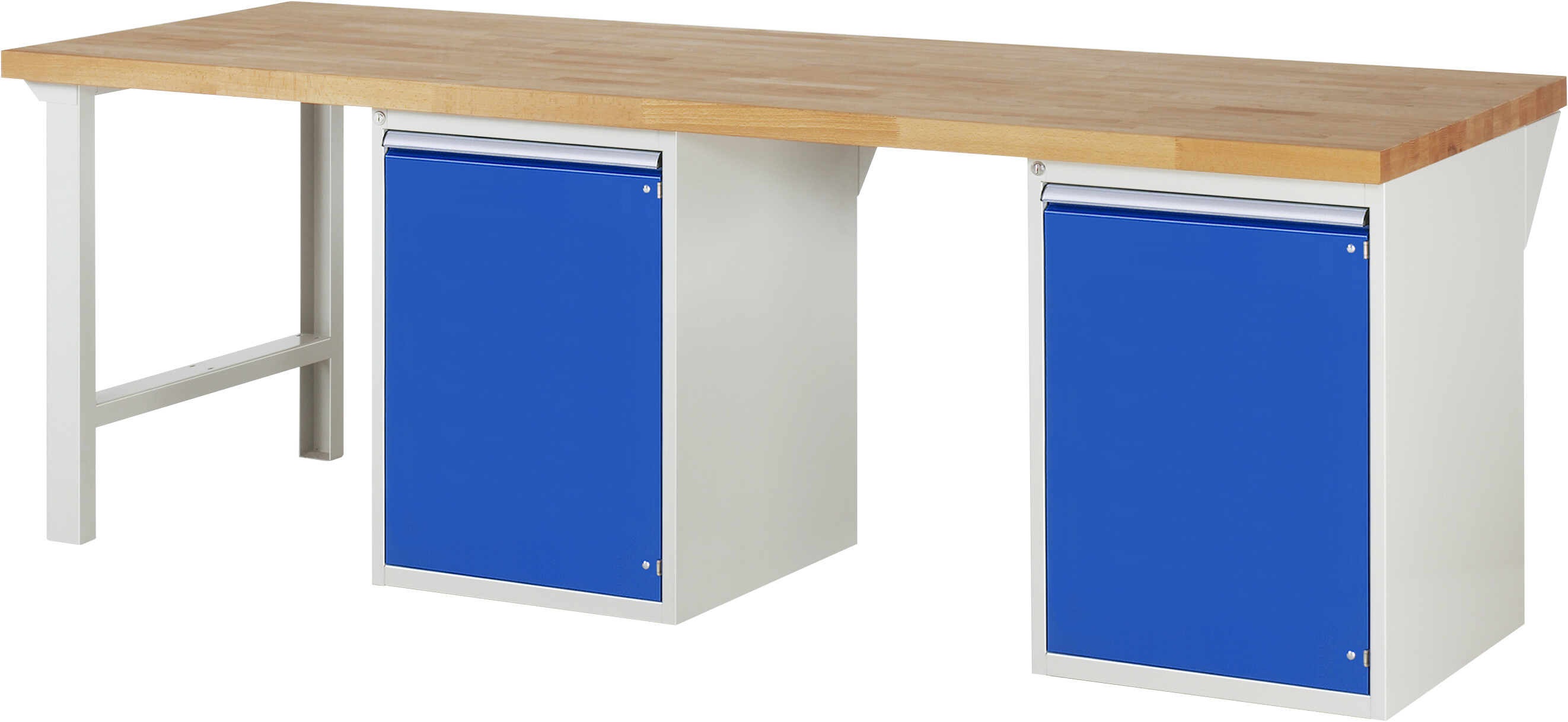 Werkbank Serie 7000 - Modell 7501 B2500 x T900 x H890 mm Buche-Massiv-Platte 40 mm. 2 Standcontainer mit je 1 x Flügeltür (H720 mm mit Fachboden höhenverstellbar). Pulverbeschichtung Flächenlast max. 1.000 kg Lieferung komplett montiert Qualitätsgarantie 5 Jahre Made in Germany