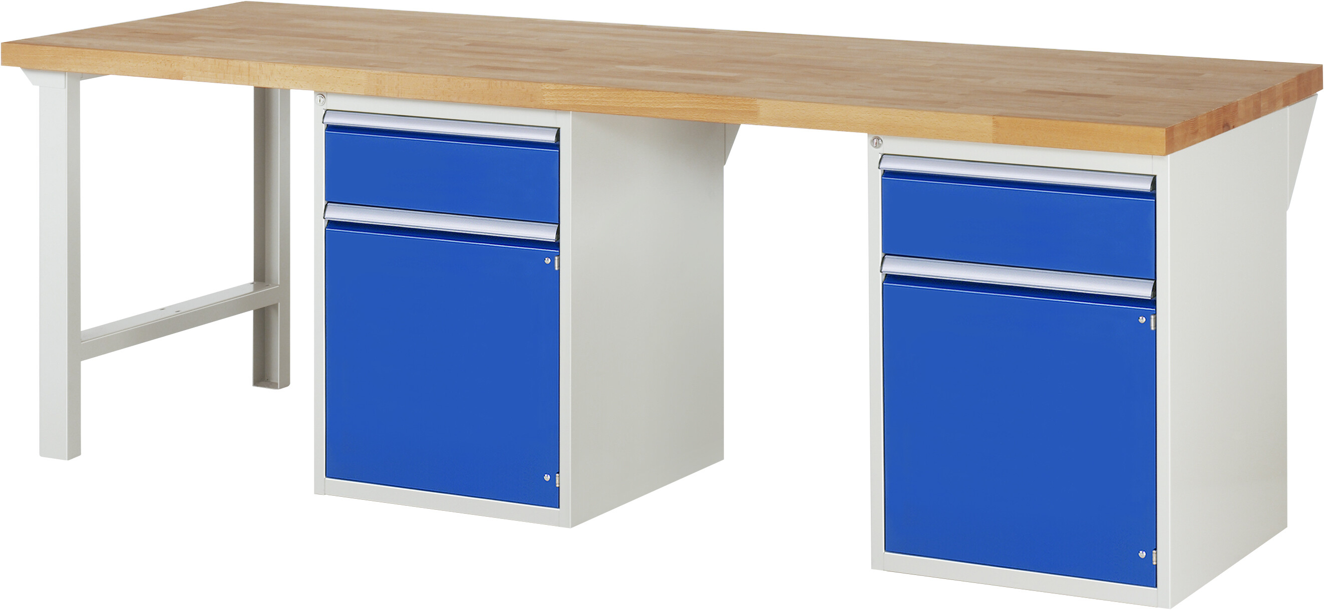 Werkbank Serie 7000 - Modell 7502 B2500 x T900 x H890 mm Buche-Massiv-Platte 40 mm. 2 Standcontainer mit je 2 x Schublade (2xH180 mm). 2 x Flügeltür (H540 mm mit Fachboden höhenverstellbar). Pulverbeschichtung Flächenlast max. 1.000 kg Lieferung komplett montiert Qualitätsgarantie 5 Jahre Made in Germany