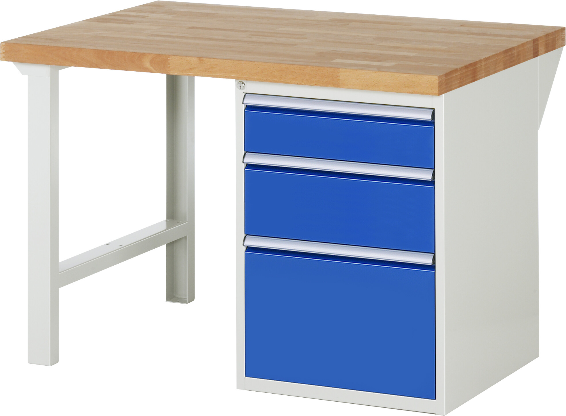 Werkbank Serie 7000 - Modell 7508 B1250 x T900 x H890 mm Buche-Massiv-Platte 40 mm. 3 x Schublade (1xH150, 1xH210, 1xH360 mm). Pulverbeschichtung Flächenlast max. 1.000 kg Lieferung komplett montiert Qualitätsgarantie 5 Jahre Made in Germany