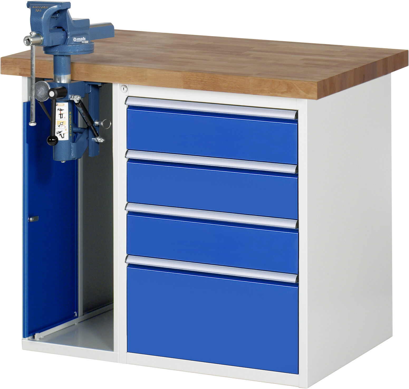 Werkbank Serie 7000 - Modell 7510 B1000 x T700x H840 mm Buche-Massiv-Platte 40 mm. 1 x Schraubstock. 4 x Schublade (3xH150, 1xH270 mm). Pulverbeschichtung Flächenlast max. 1.000 kg Lieferung komplett montiert Qualitätsgarantie 5 Jahre Made in Germany