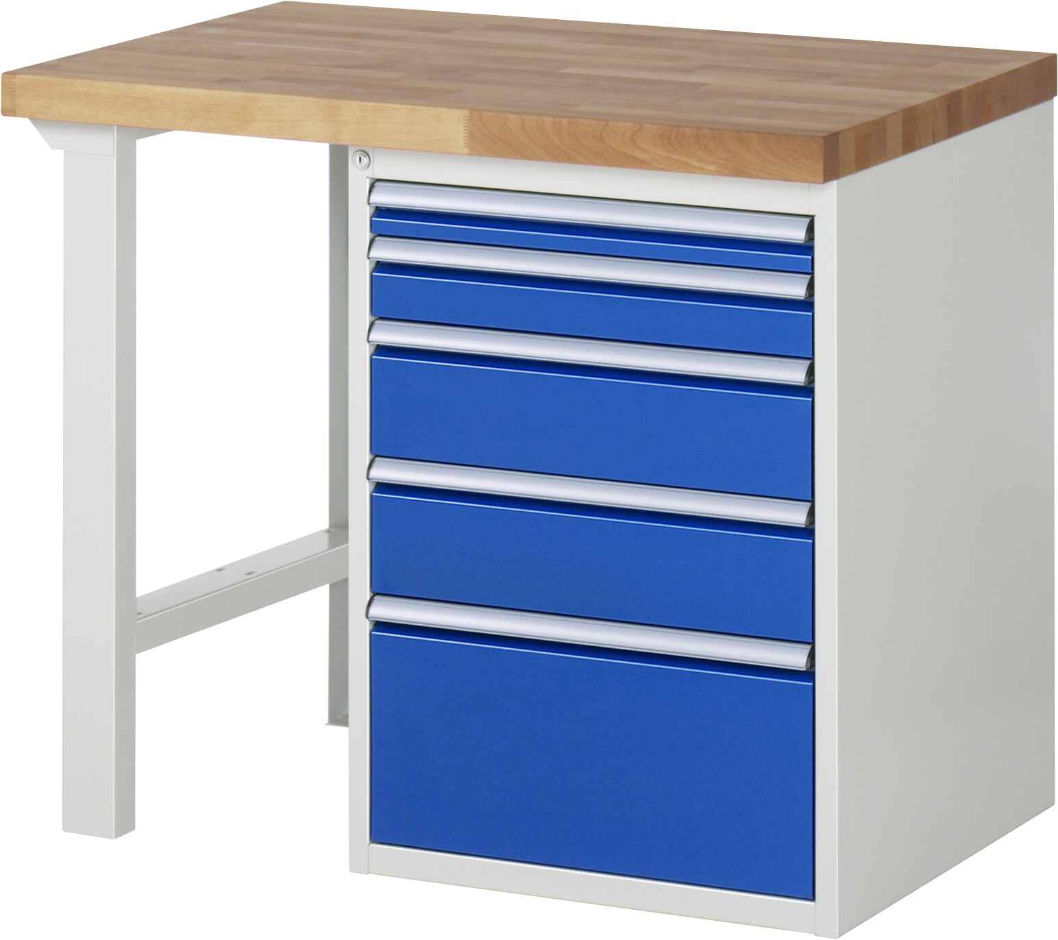 Werkbank Serie 7000 - Modell 7511 B1000 x T700 x H890 mm Buche-Massiv-Platte 40 mm. 5 x Schublade (1xH60, 1xH90, 2xH150, 1xH270 mm). Pulverbeschichtung Flächenlast max. 1.000 kg Lieferung komplett montiert Qualitätsgarantie 5 Jahre Made in Germany