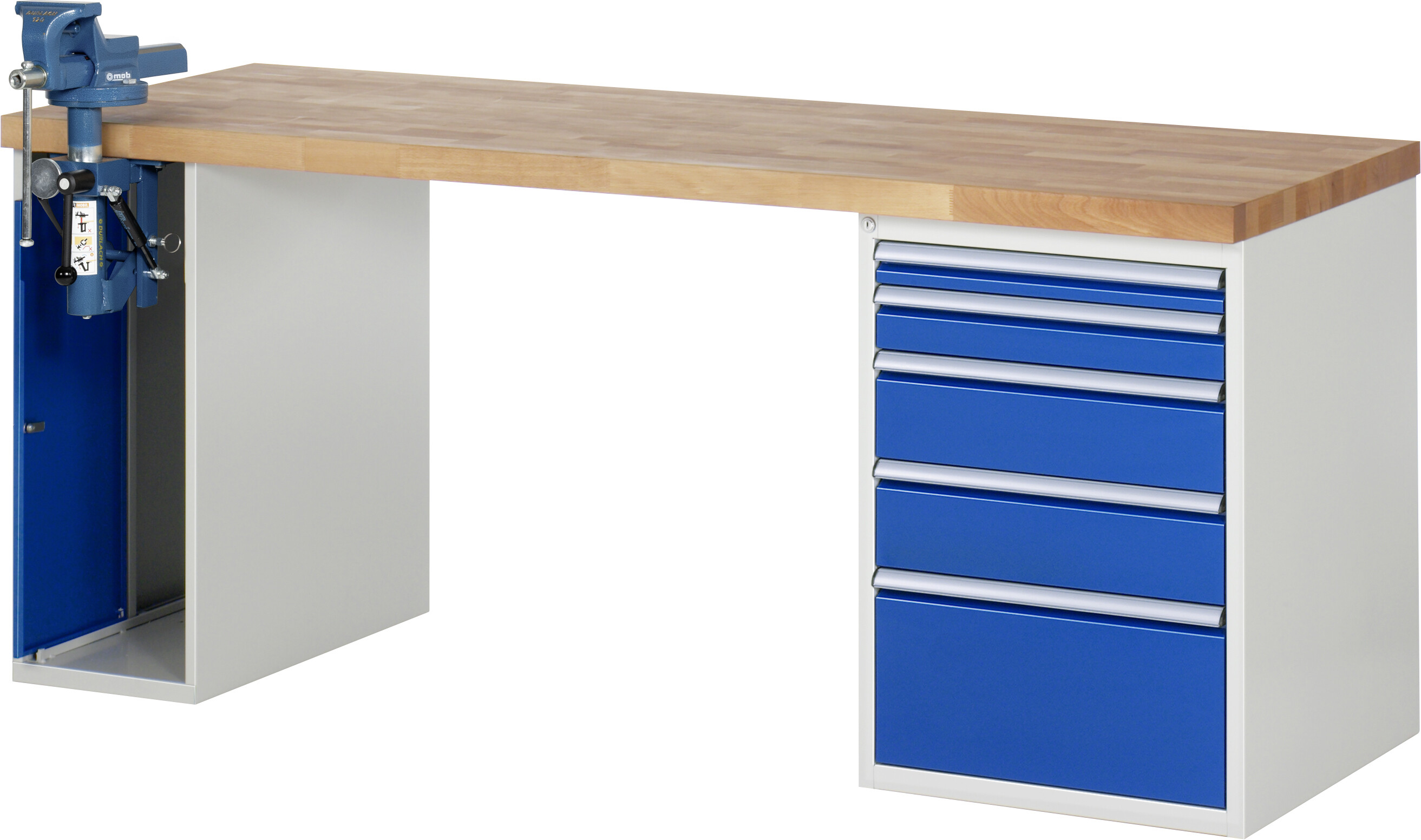 Werkbank Serie 7000 - Modell 7511 B2000 x T700 x H840 mm Buche-Massiv-Platte 40 mm. 1 x Schraubstock. 5 x Schublade (1xH60, 1xH90, 2xH150, 1xH270 mm). Pulverbeschichtung Flächenlast max. 1.000 kg Lieferung komplett montiert Qualitätsgarantie 5 Jahre Made in Germany