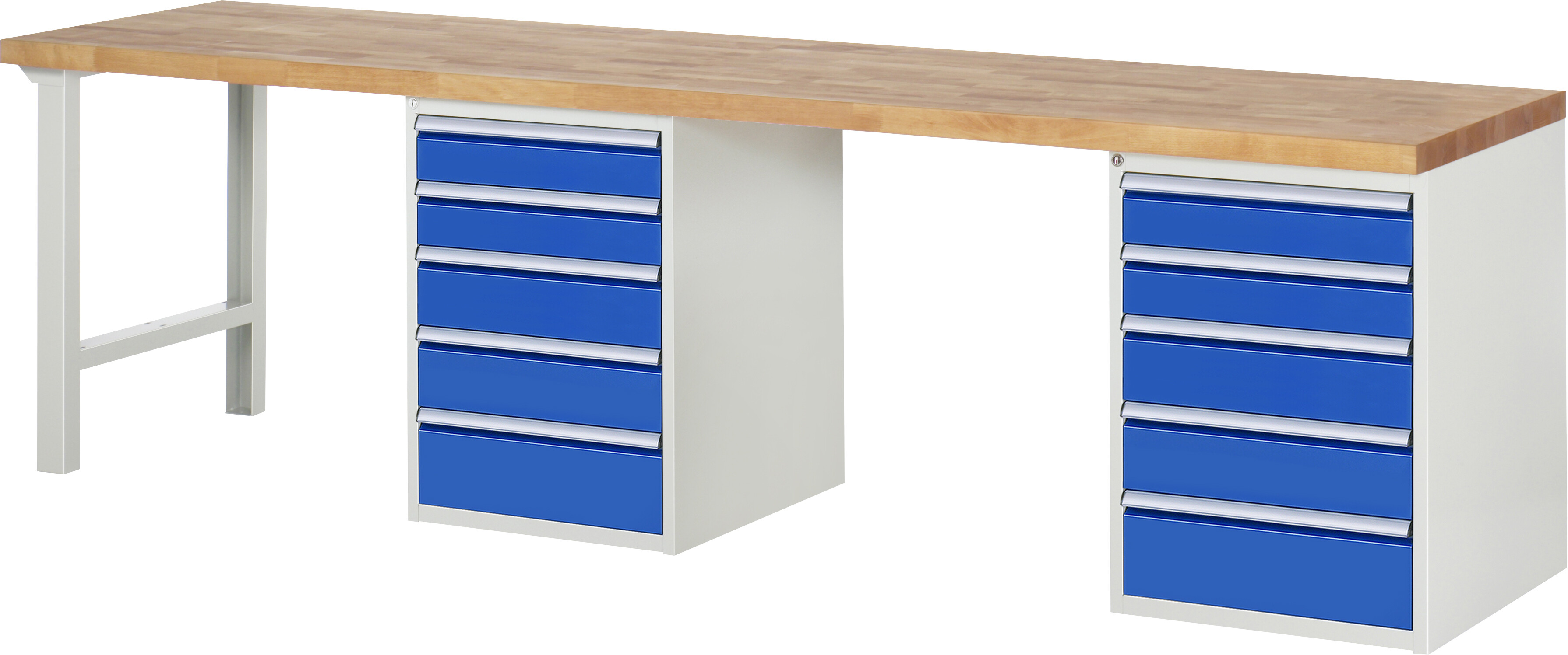 Werkbank Serie 7000 - Modell 7513 B3000 x T700 x H890 mm Buche-Massiv-Platte 40 mm. 2 Standcontainer mit je 5 x Schublade (2xH120, 2xH150, 1xH180 mm). Pulverbeschichtung Flächenlast max. 1.000 kg Lieferung komplett montiert Qualitätsgarantie 5 Jahre Made in Germany