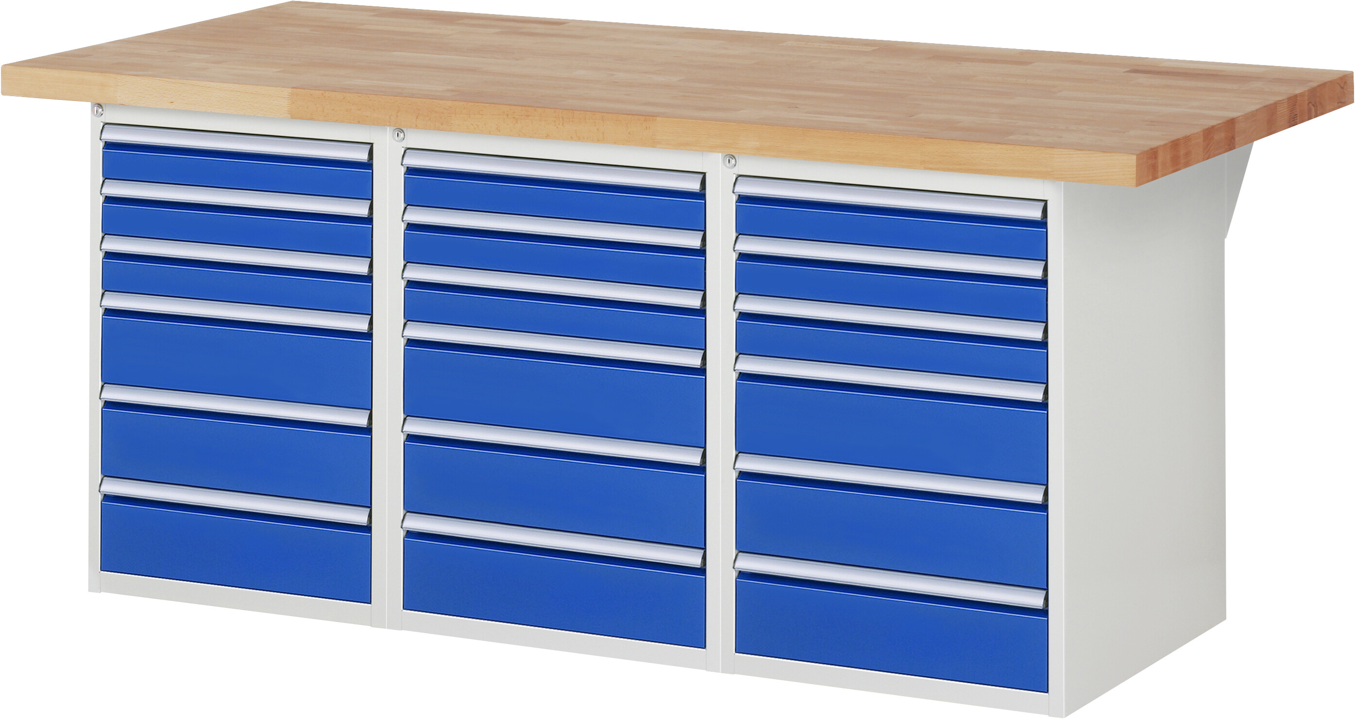 Werkbank Serie 7000 - Modell 7515 B2000 x T900 x H840 mm Buche-Massiv-Platte 40 mm. 3 Standcontainer mit je 6 x Schublade (3xH90, 3xH150 mm). Pulverbeschichtung Flächenlast max. 1.000 kg Lieferung komplett montiert Qualitätsgarantie 5 Jahre Made in Germany