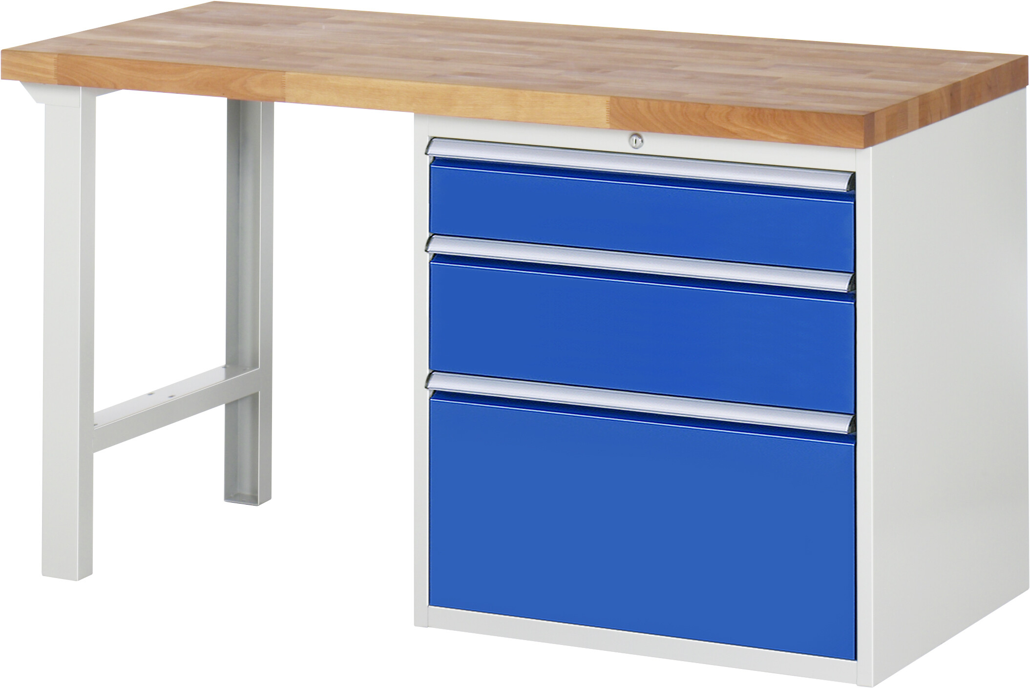 Werkbank Serie 7000 - Modell 7608 B1500 x T700 x H840 mm Buche-Massiv-Platte 40 mm. 3 x Schublade (1xH150, 1xH210, 1xH360 mm). Pulverbeschichtung Flächenlast max. 1.000 kg Lieferung komplett montiert Qualitätsgarantie 5 Jahre Made in Germany