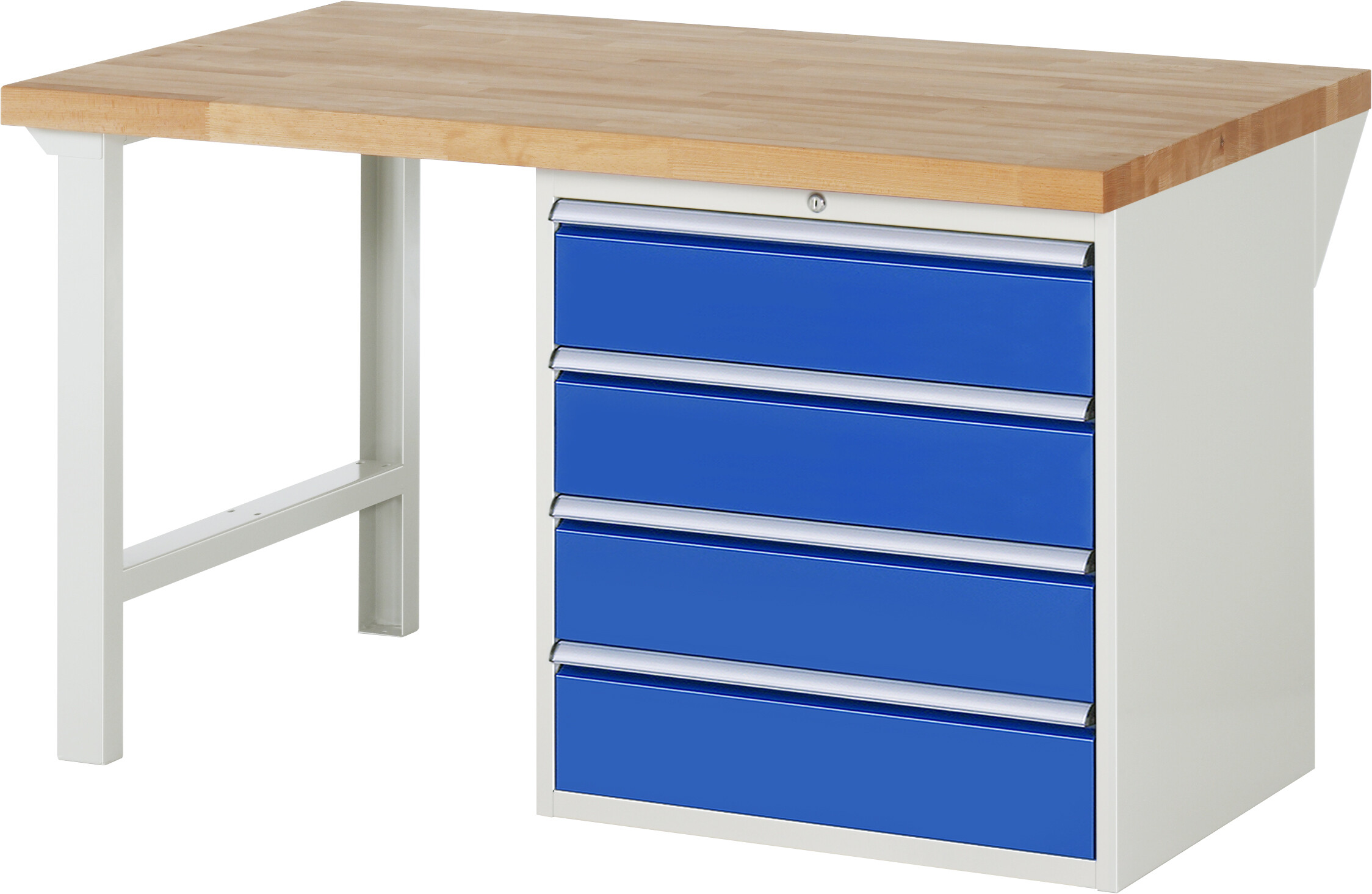 Werkbank Serie 7000 - Modell 7609 B1500 x T900 x H890 mm Buche-Massiv-Platte 40 mm. 4 x Schublade (4xH180 mm). Pulverbeschichtung Flächenlast max. 1.000 kg Lieferung komplett montiert Qualitätsgarantie 5 Jahre Made in Germany