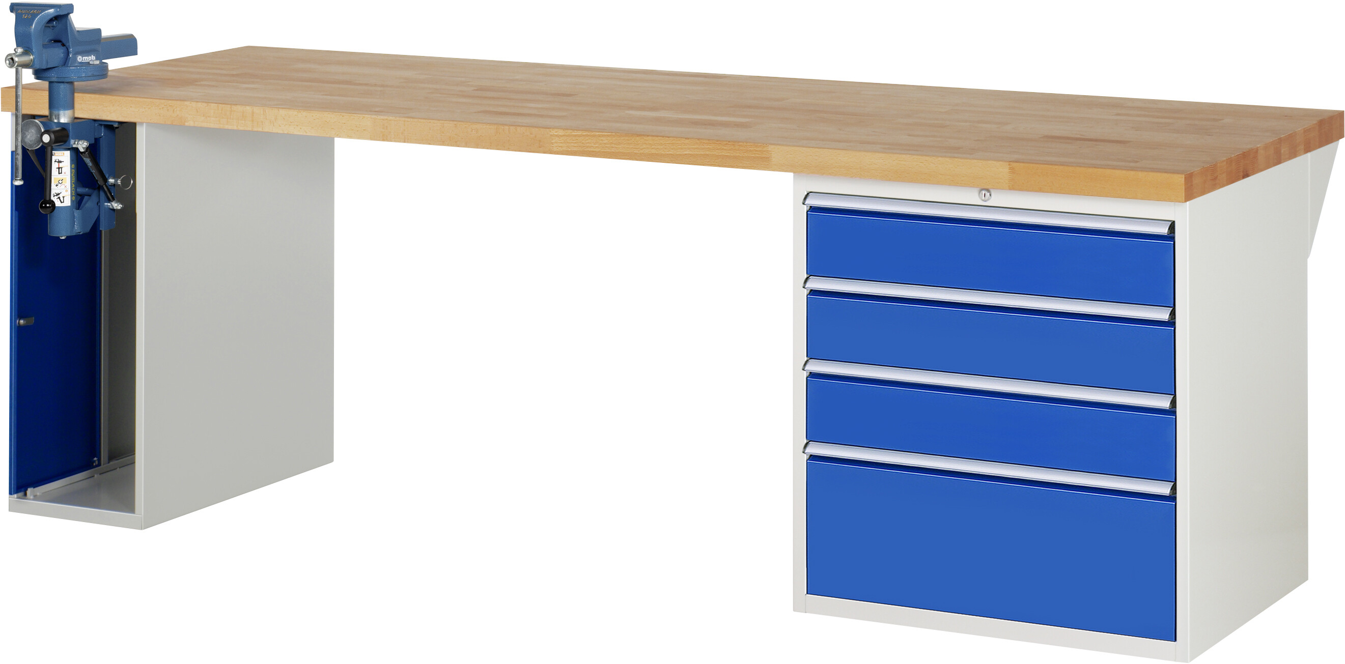Werkbank Serie 7000 - Modell 7610 B2500 x T900 x H840 mm Buche-Massiv-Platte 40 mm. 1 x Schraubstock. 4 x Schublade (3xH150, 1xH270 mm). Pulverbeschichtung Flächenlast max. 1.000 kg Lieferung komplett montiert Qualitätsgarantie 5 Jahre Made in Germany