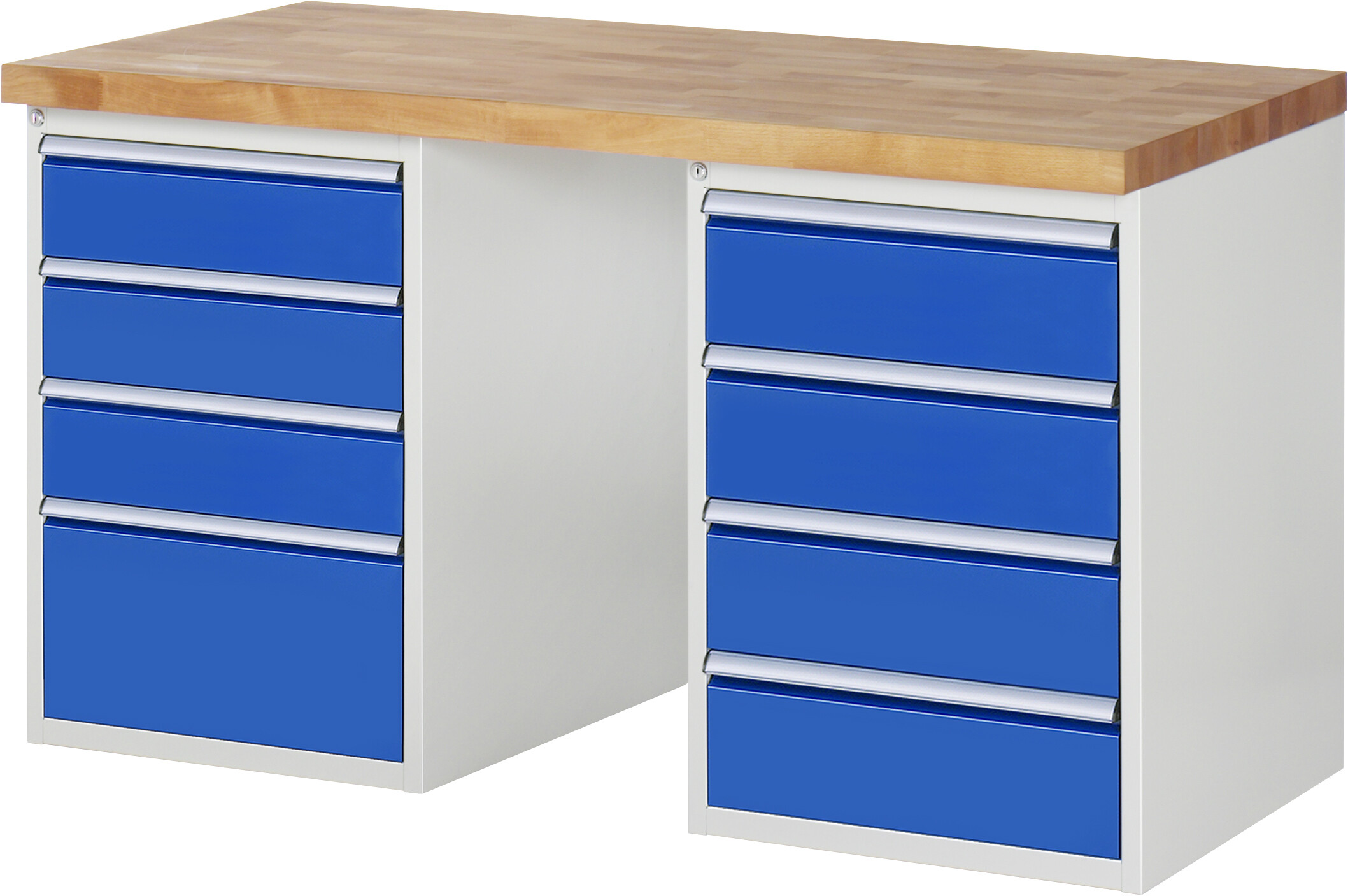 Werkbank Serie 7000 - Modell 7820 B1500 x T700 x H890 mm Buche-Massiv-Platte 40 mm. 2 Standcontainer: 1x (3xH150, 1xH270 mm), 1x (4xH180 mm). Pulverbeschichtung Flächenlast max. 1.000 kg Lieferung komplett montiert Qualitätsgarantie 5 Jahre Made in Germany