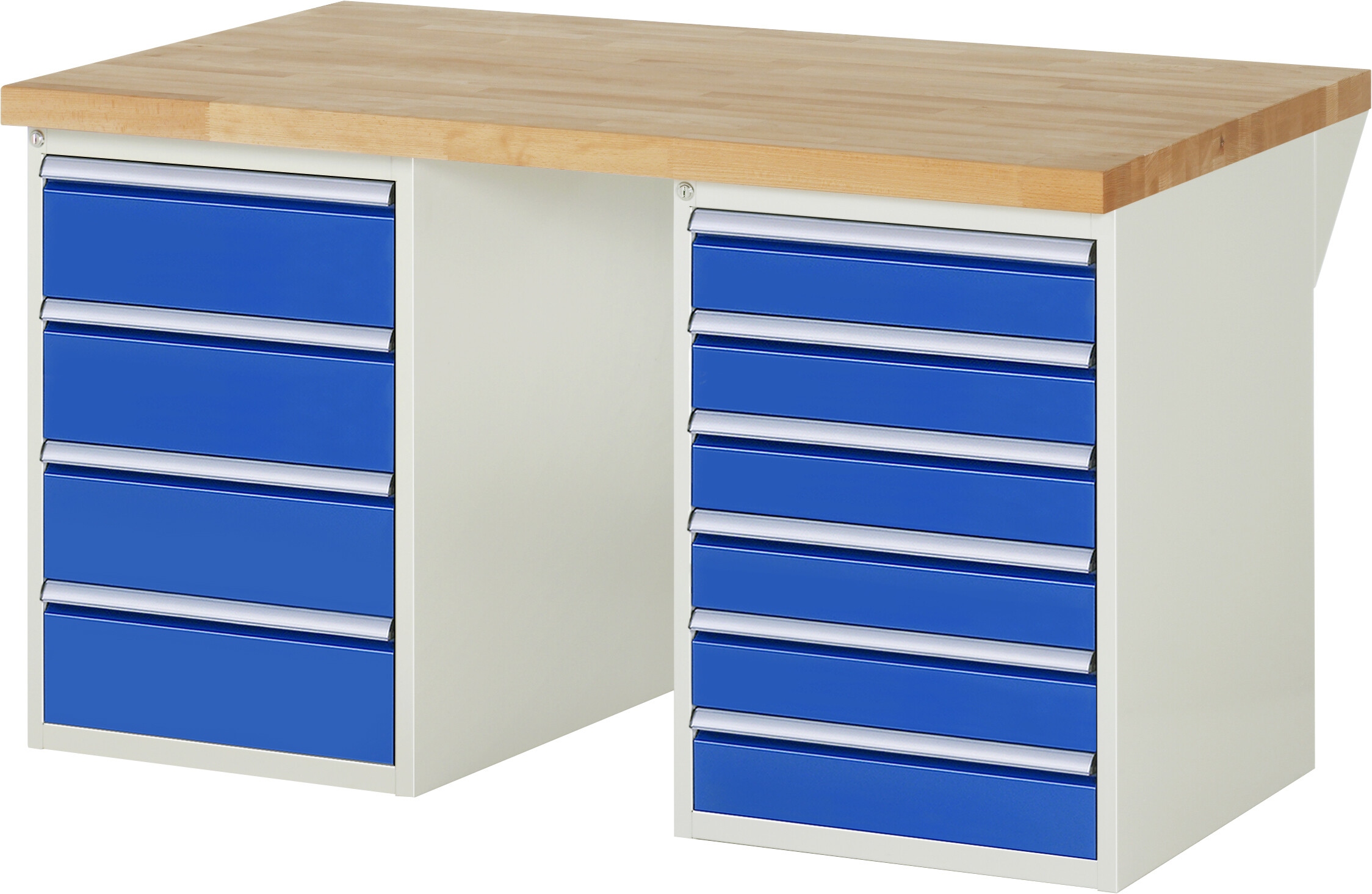 Werkbank Serie 7000 - Modell 7821 B1500 x T900 x H890 mm Buche-Massiv-Platte 40 mm. 2 Standcontainer: 1x (4xH180 mm), 1x (6xH120 mm). Pulverbeschichtung Flächenlast max. 1.000 kg Lieferung komplett montiert Qualitätsgarantie 5 Jahre Made in Germany