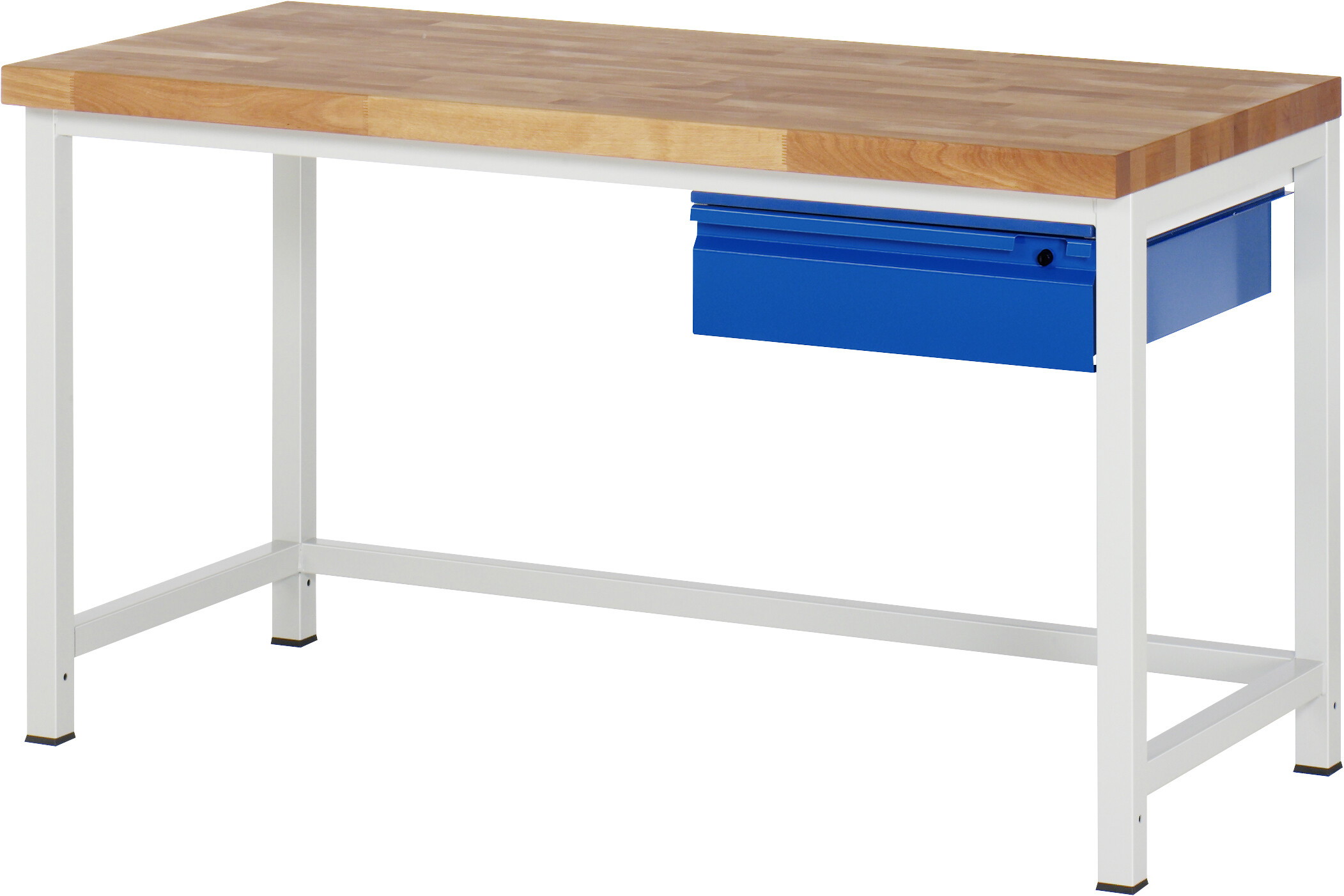 Werkbank Serie 8000 - Modell 8001 BASIC B1500 x T700 x H840-1040 mm Buche-Massiv-Arbeitsplatte 40 mm. Gestell Vierkantrohr. Werkbank mit einstellbarer Arbeitshöhe. 1 x Schublade auf rollengelagerten Auszugsschienen (1xH150 mm). Pulverbeschichtung Flächenlast max. 1.250 kg Lieferung komplett montiert Qualitätsgarantie 5 Jahre Made in Germany