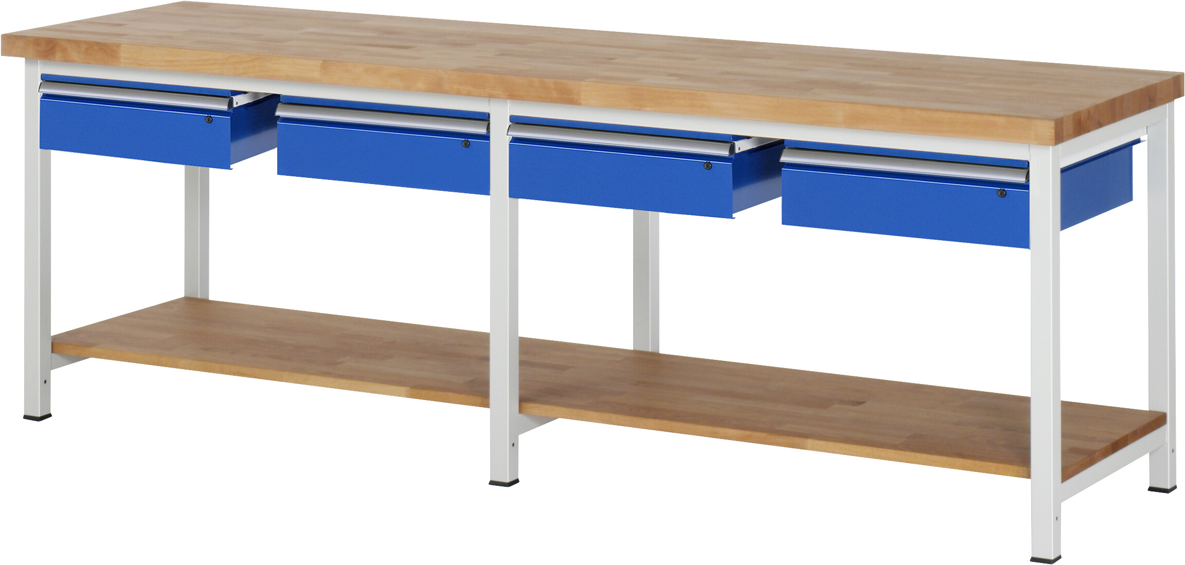 Werkbank Serie 8000 - Modell 8002 B2500 x T700 x H840 mm Buche-Massiv-Arbeitsplatte 40 mm. Gestell Vierkantrohr. Werkbank mit Buche-Massiv-Ablageboden (T 545 mm). 4 x Schublade auf rollengelagerten Auszugsschienen (4xH150 mm). Pulverbeschichtung Flächenlast max. 1.250 kg Lieferung komplett montiert Qualitätsgarantie 5 Jahre Made in Germany