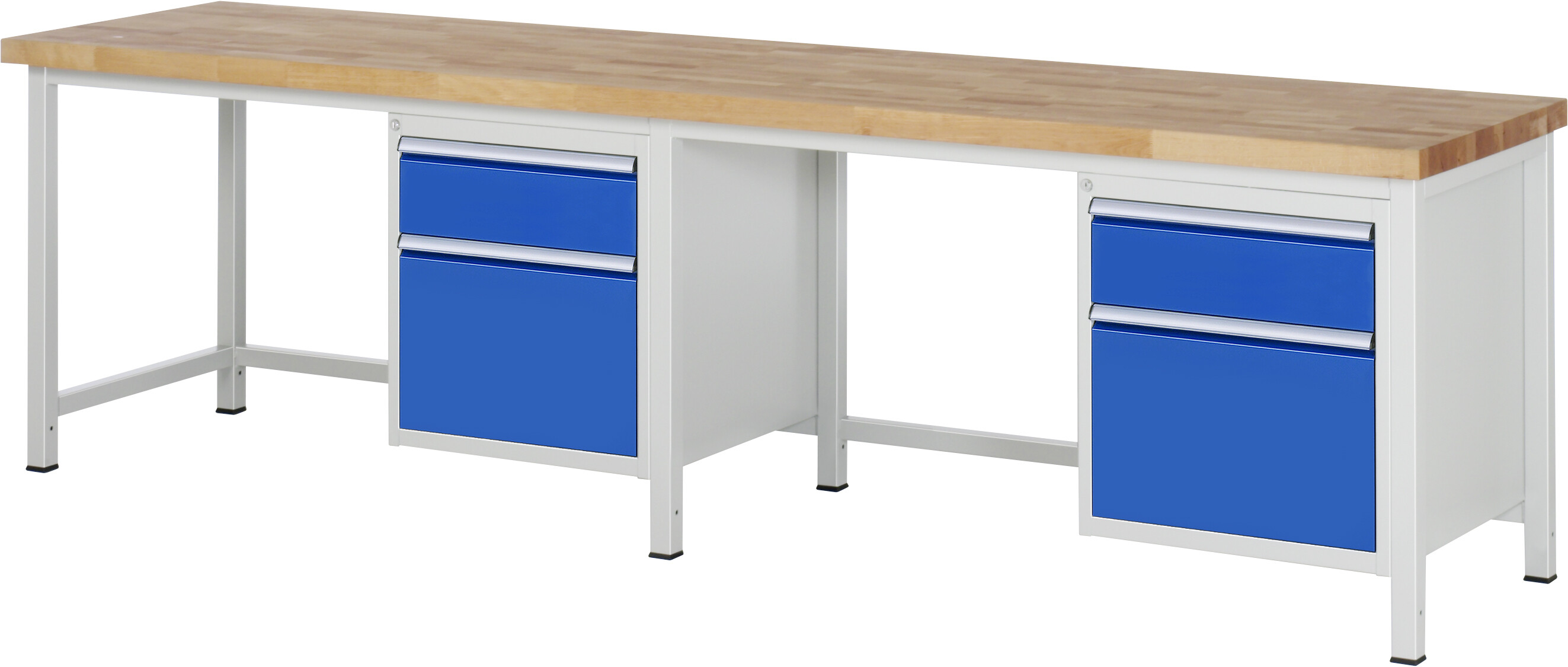 Werkbank Serie 8000 - Modell 8156 B3000 x T700 x H840 mm Buche-Massiv-Arbeitsplatte 40 mm. Gestell Vierkantrohr. 4 x Schublade (2xH180, 2xH360 mm). Pulverbeschichtung Flächenlast max. 1.250 kg Lieferung komplett montiert Qualitätsgarantie 5 Jahre Made in Germany