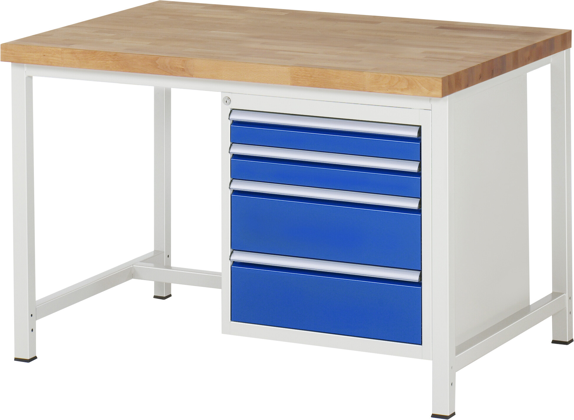 Werkbank Serie 8000 - Modell 8161 B1250 x T900 x H840 mm Buche-Massiv-Arbeitsplatte 40 mm. Gestell Vierkantrohr. 4 x Schublade (2xH90, 2xH180 mm). Pulverbeschichtung Flächenlast max. 1.250 kg Lieferung komplett montiert Qualitätsgarantie 5 Jahre Made in Germany